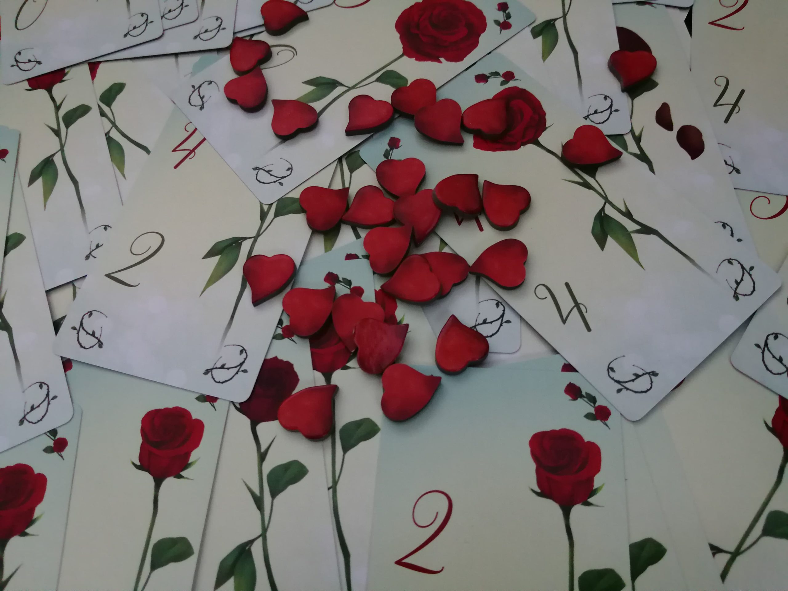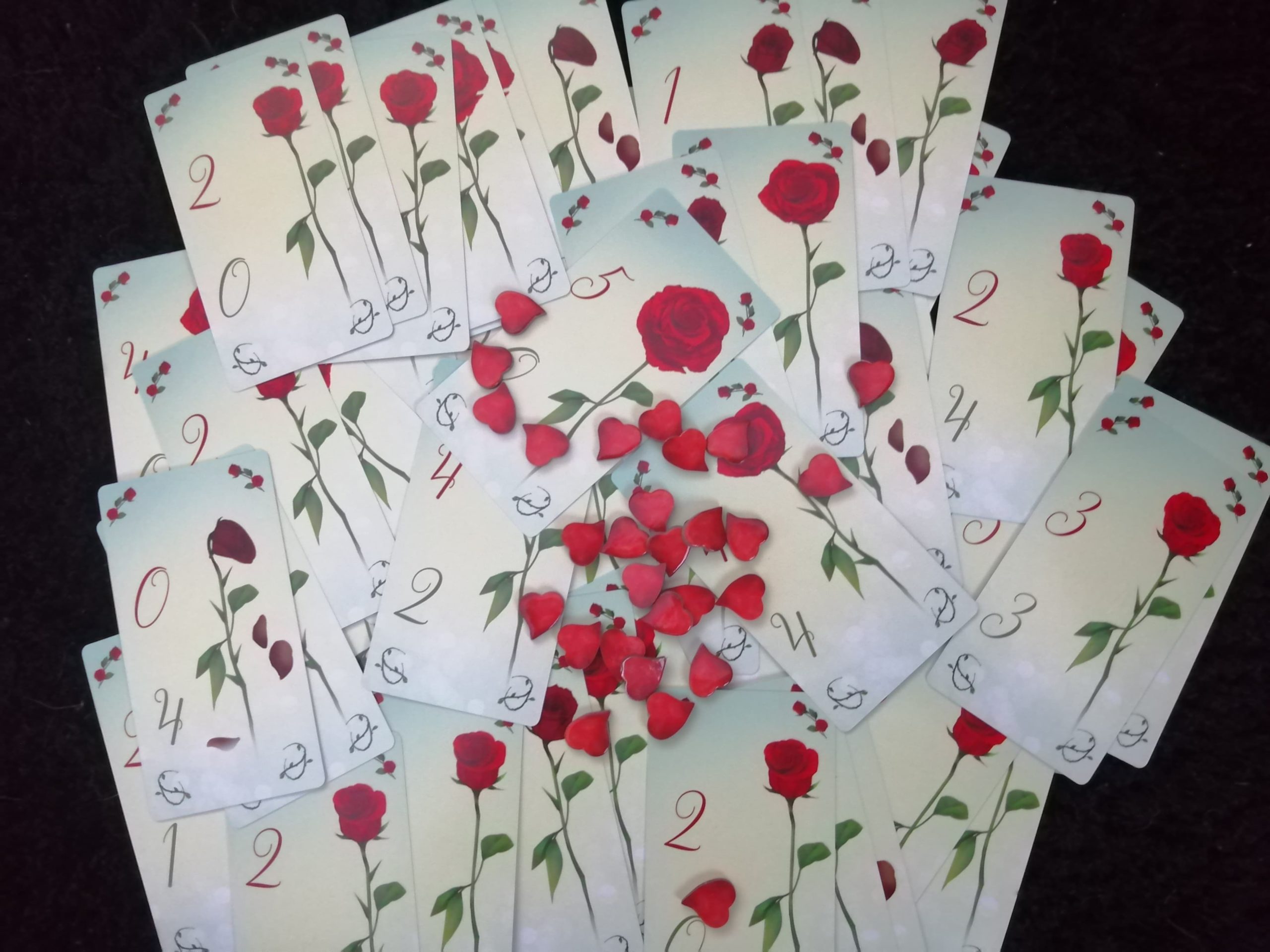 Le jeu est composé de 54 grandes cartes Rose et de 28 jetons Cœur.