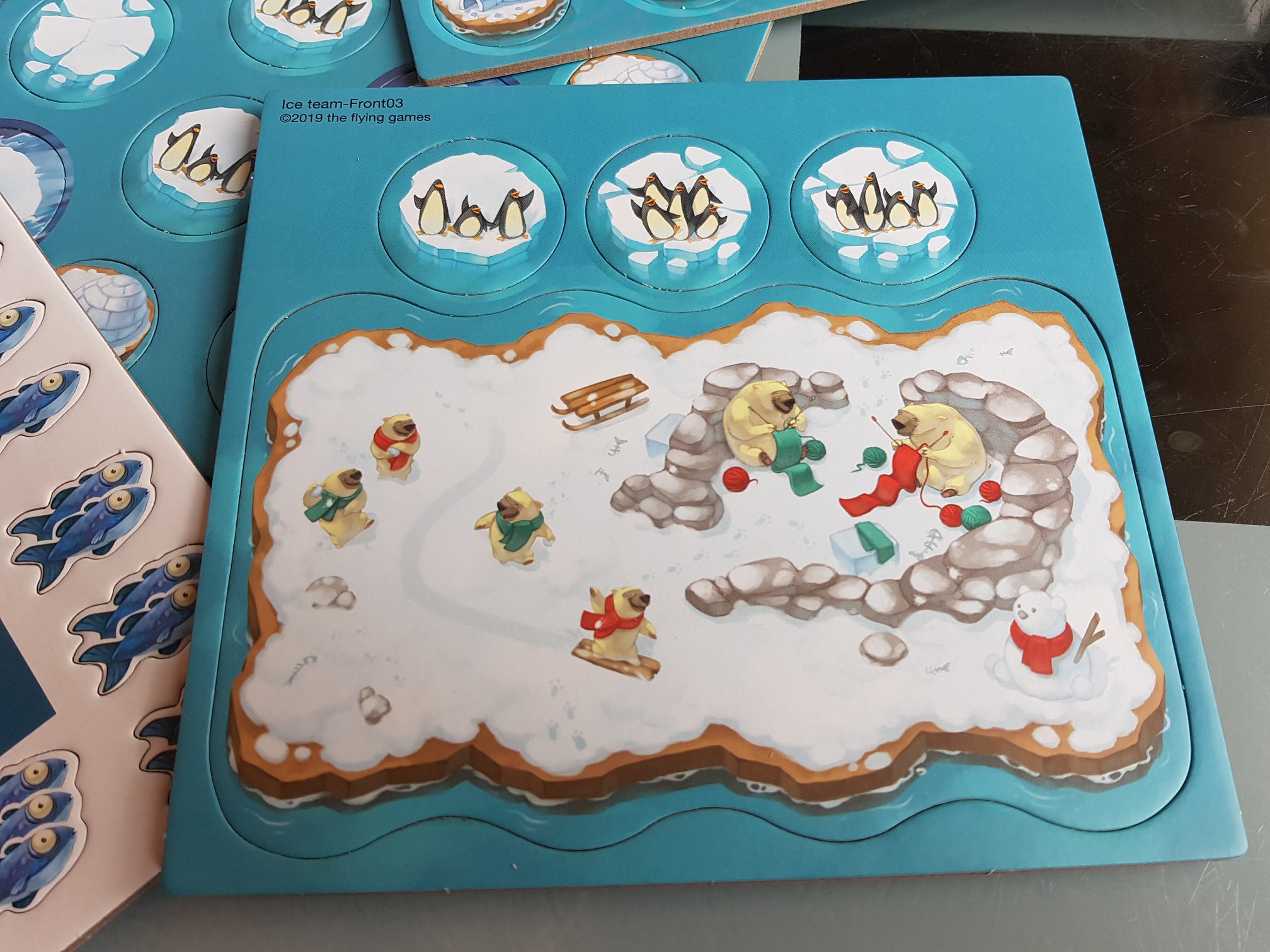 Des tuiles pingouins qui remplacent la criée lorsque les bateaux rentrent au port. C’est à dire qu’ils vont vous congeler 1 de vos poissons afin que votre adversaire ne puisse plus vous les voler durant la partie! Une sorte de doggy-bag tout frais.