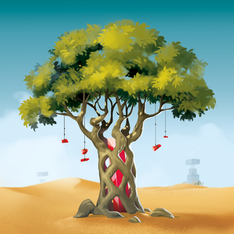 Plantation d’un arbre. Le joueur choisit l’une des 5 cartes visibles, paye le coût en gemmes et la pose devant lui face cachée. A la fin de la partie il ajoutera les PV indiqués sur la carte à son score. Il prend aussi un jeton arbre et le pose sur une case herbe libre de son choix.