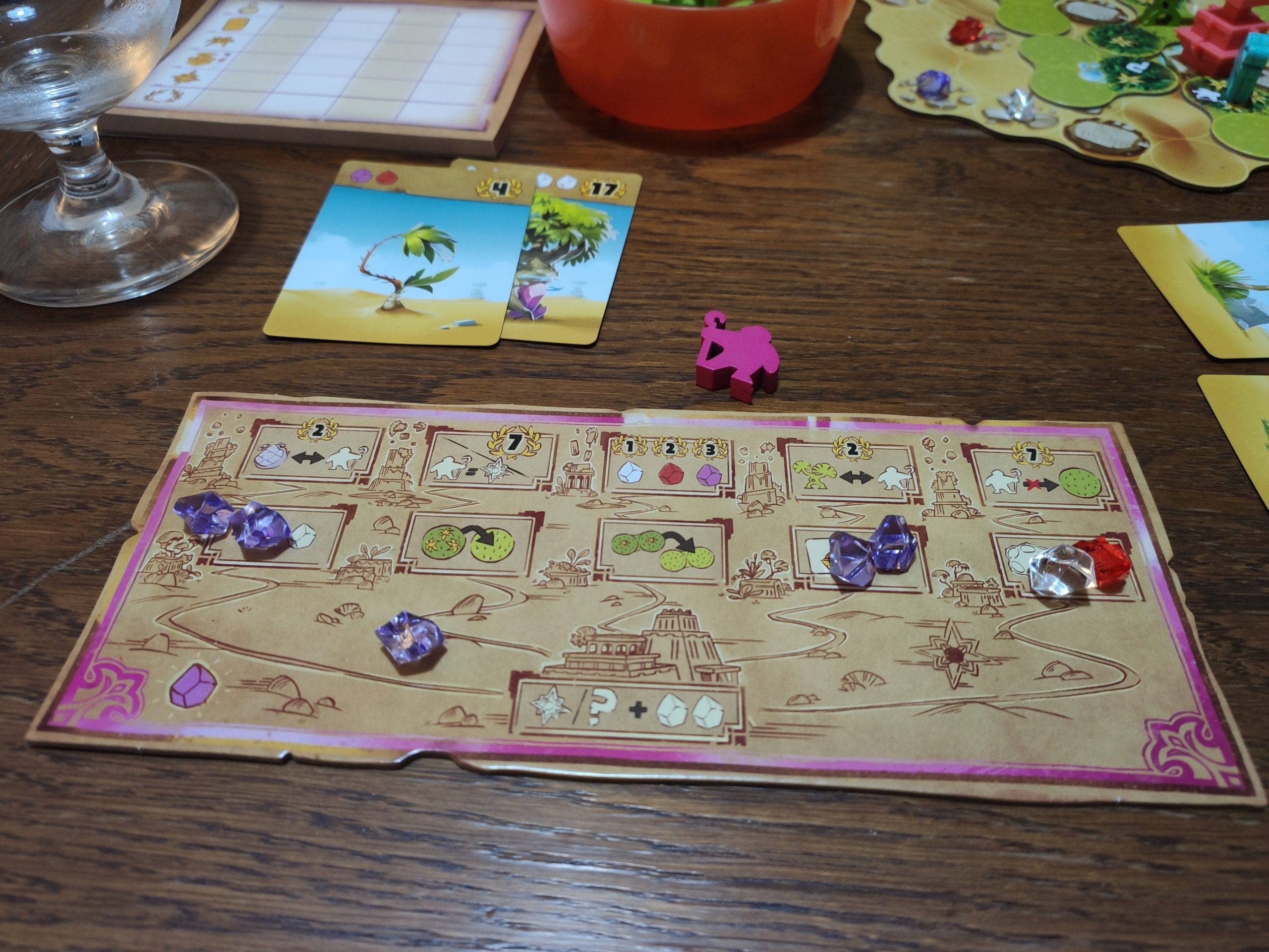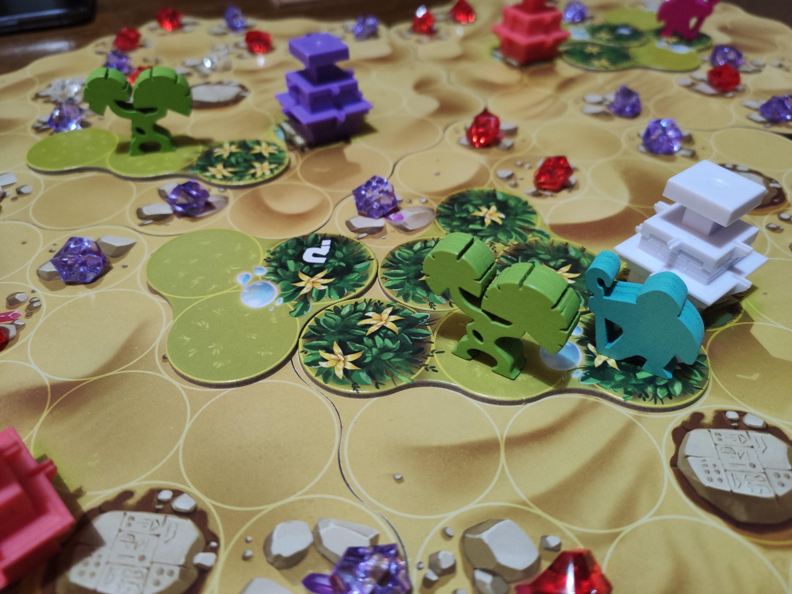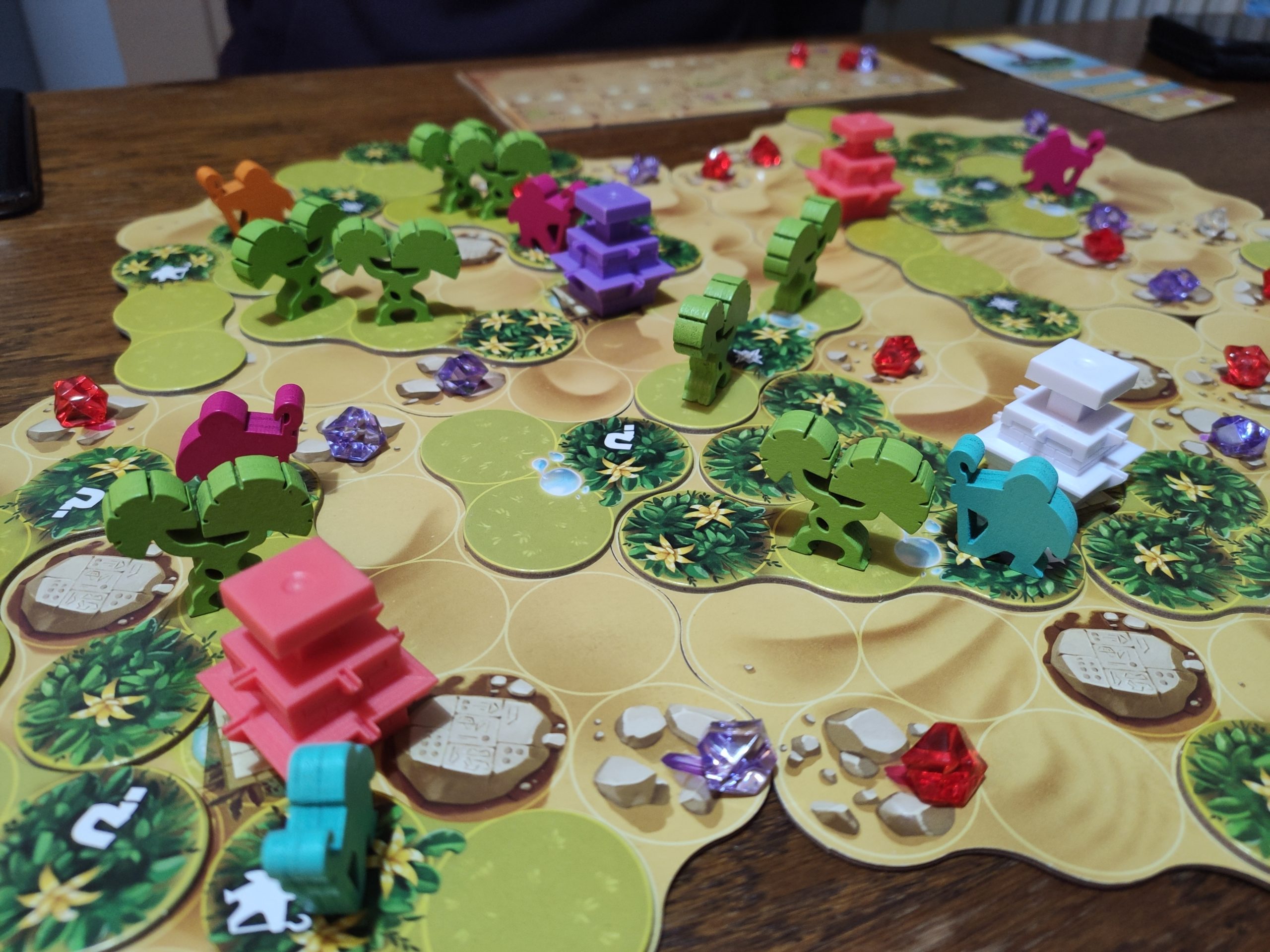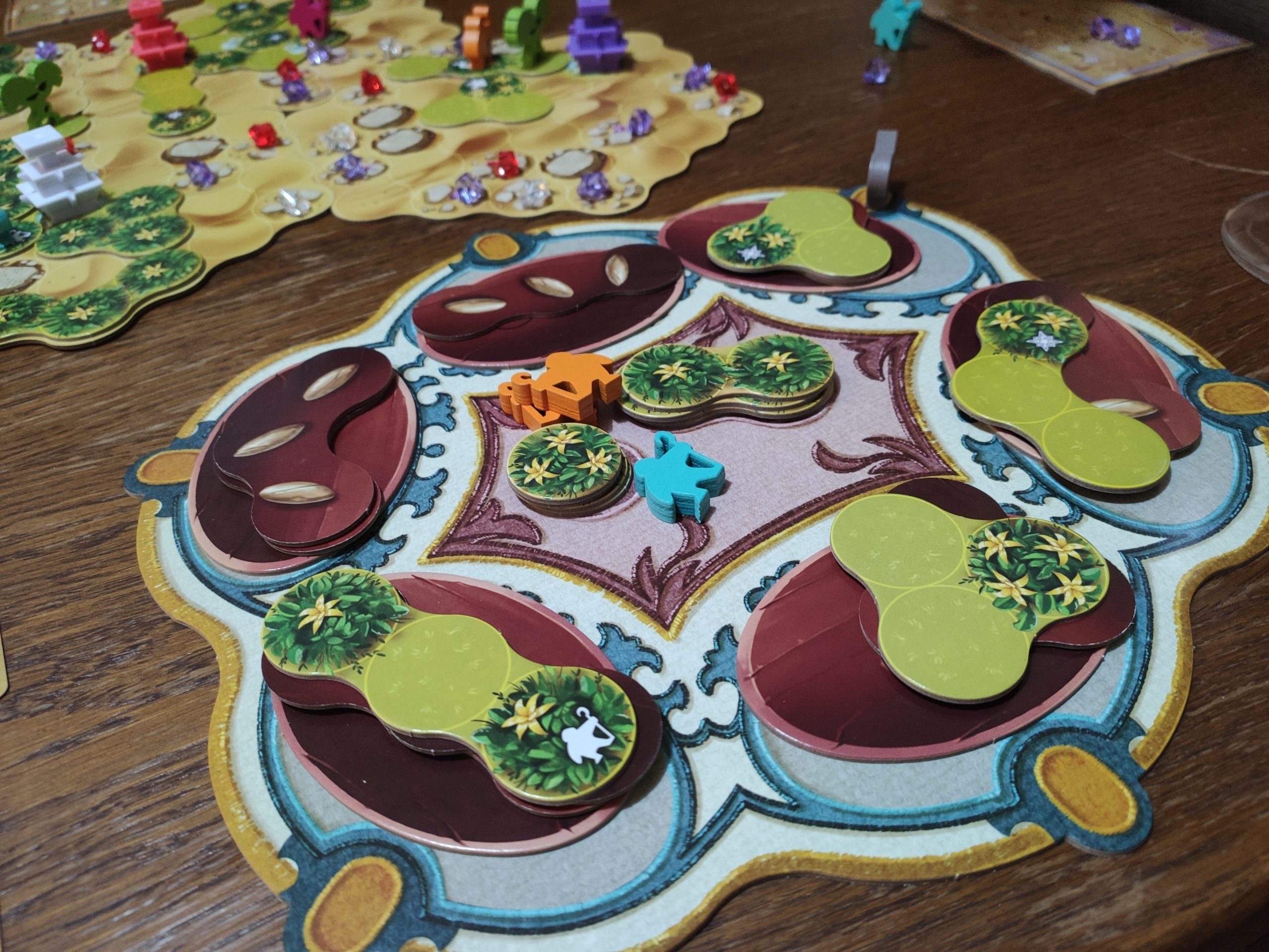 On va placer des fontaines sur les emplacements correspondants, et des gemmes de la couleur correspondante sur les rochers. Chaque joueur a aussi son plateau individuel, on y reviendra plus tard, ainsi que ses meeples assistants.