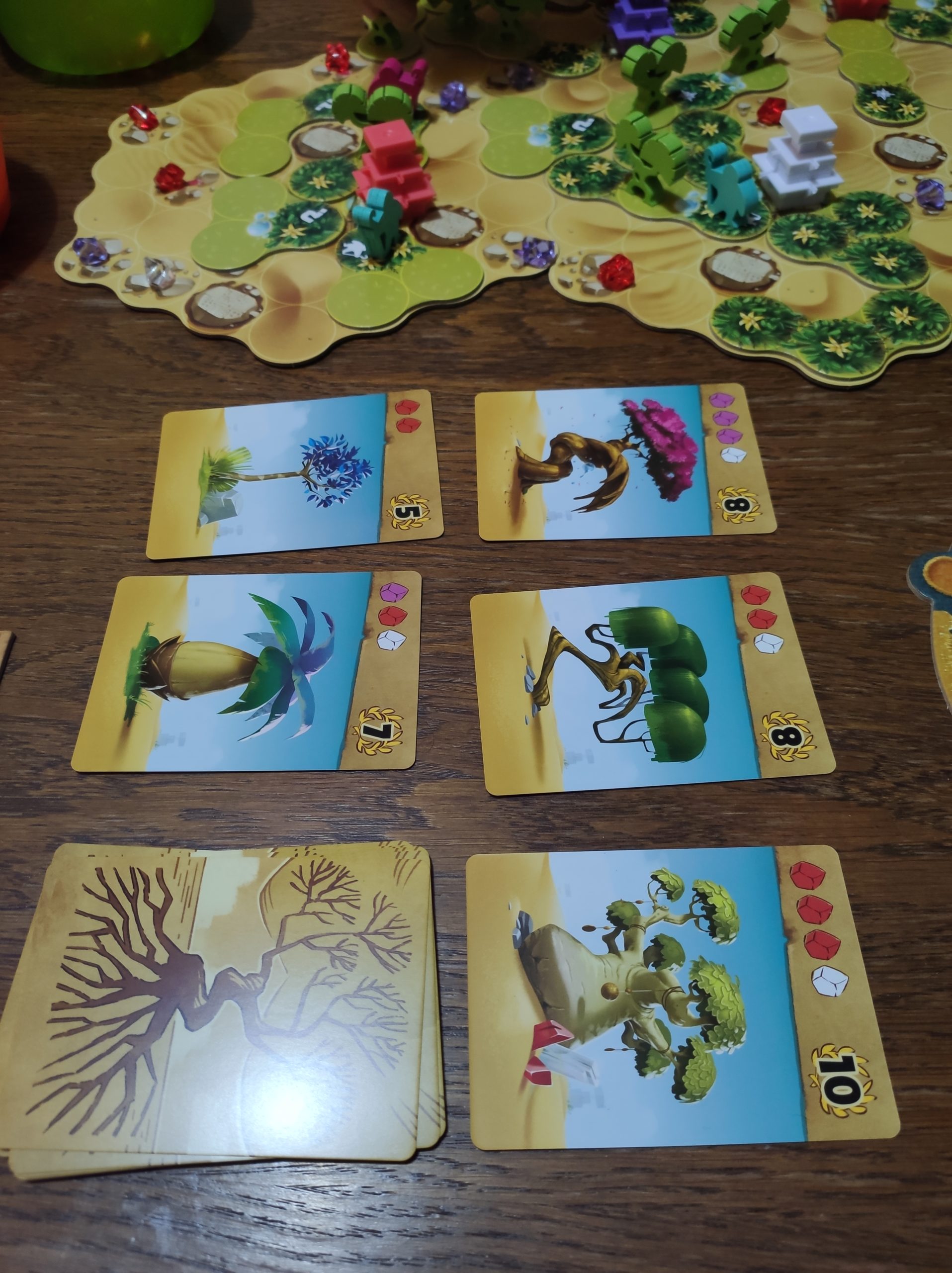 Le distributeur de tuiles (appelé plateau tapis) va accueillir les tuiles rangées par formes. Enfin on va disposer la pioche des cartes arbres, et en révéler 5 faces visibles.