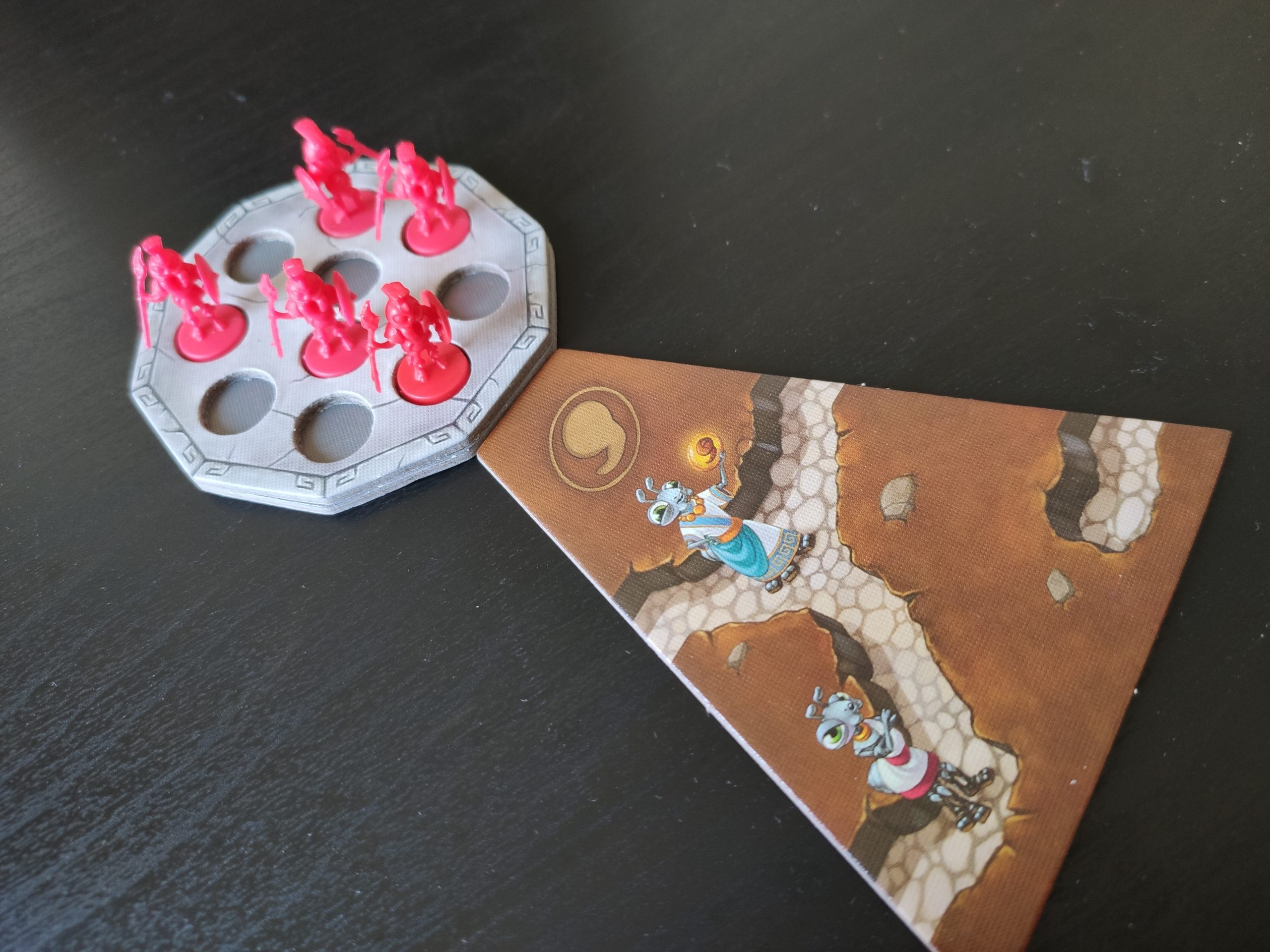 Sur la tuile fondation de départ de chaque joueur figurent aussi 5 soldats fourmis qui constituent l’armée de départ.