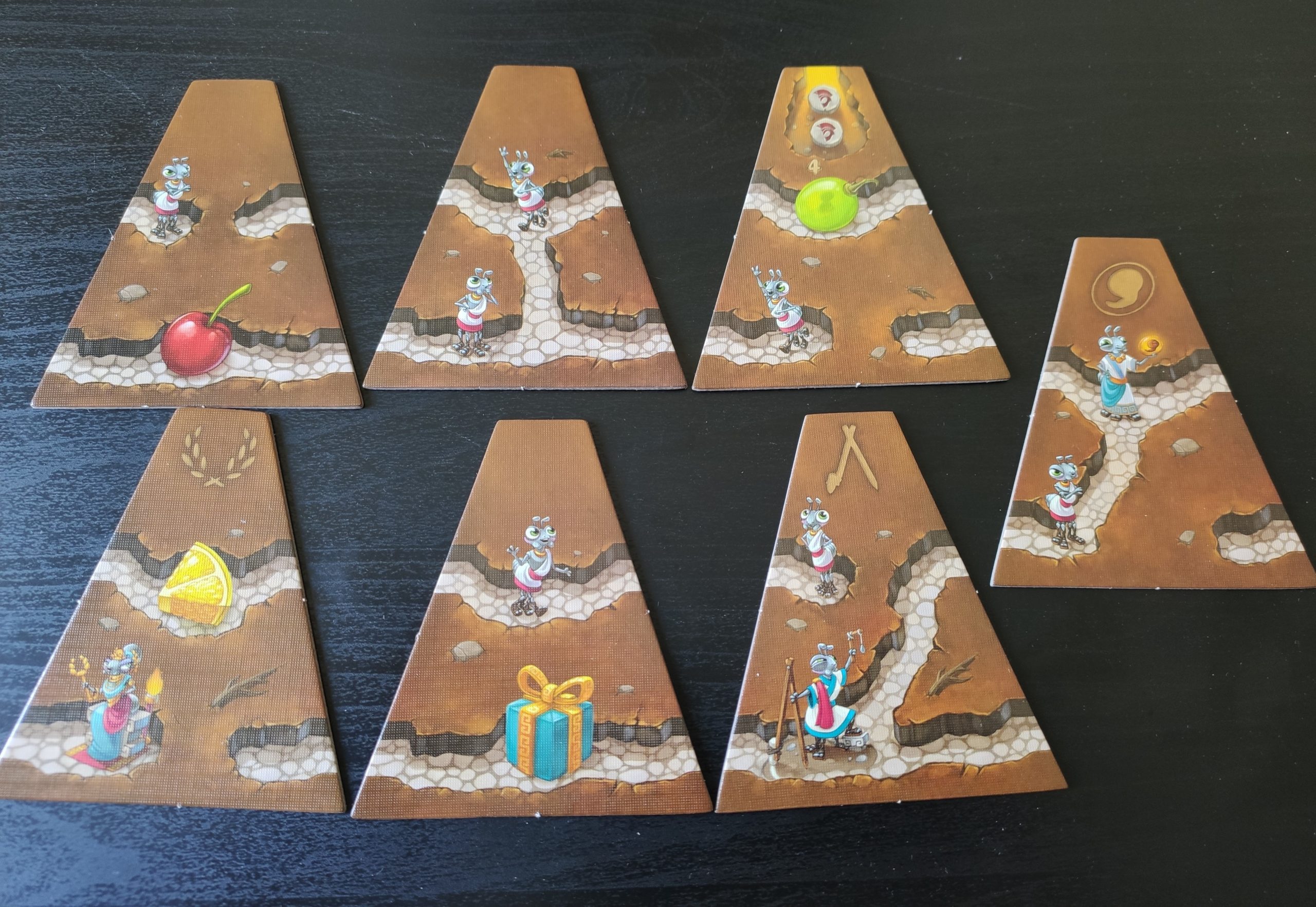 Sur les tuiles sont souvent présents des symboles de fourmis ou de nourriture. Il y a différents types de fourmis qui ont des effets variés.
