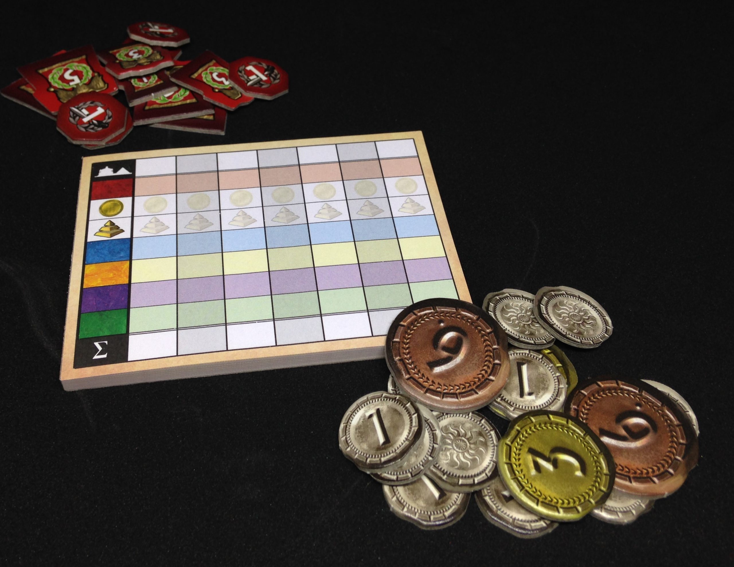 On calcule le score en additionnant les PV des cartes achetées, des colonies, des bustes, des sceaux et de l’argent restant. Rien de neuf sous le soleil, celui qui en a le + l’emporte !