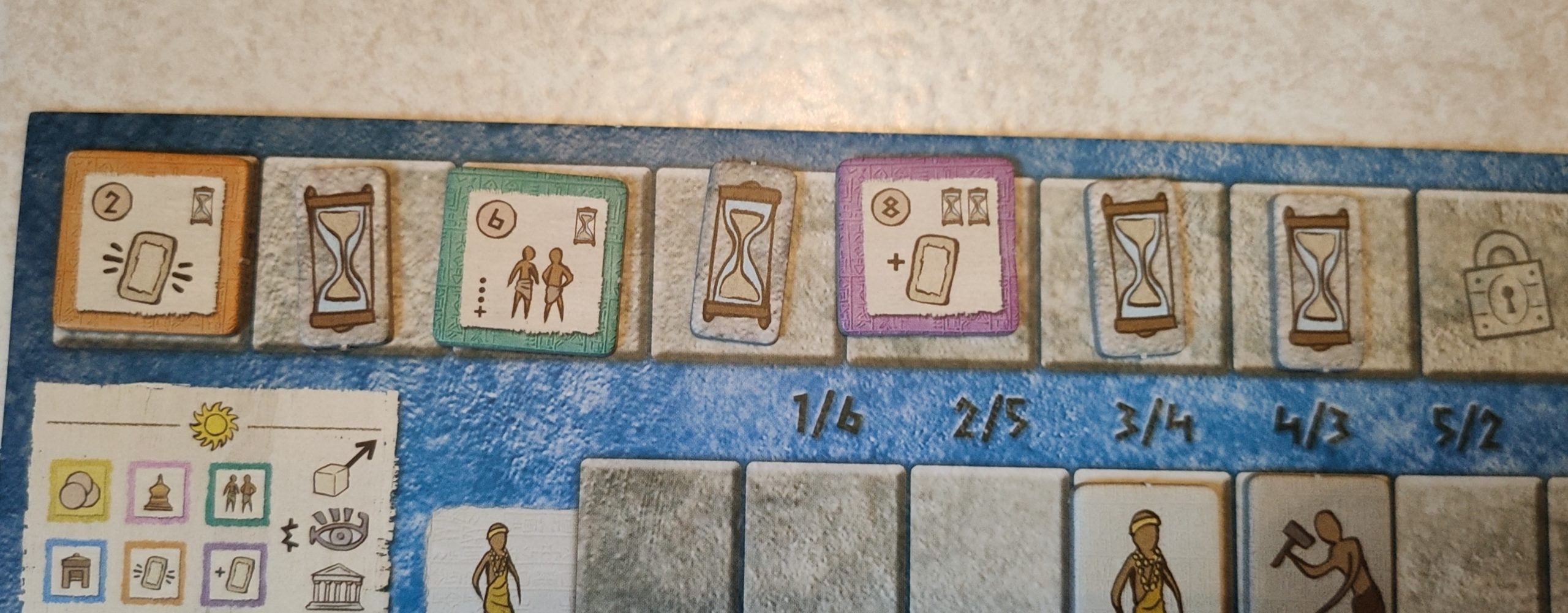 Scribe: Gagner des cartes civilisations. Il va vous falloir alimenter votre main avec des cartes pour pouvoir ensuite les poser et remporter des PV et des bonus. Une rivière de cartes est disponible en dessous du plateau central, et en fonction de la position de la carte, son coût sera + ou – élevé. Vous paierez donc potentiellement le prix fort pour une carte qui vous intéresse, si vous ne voulez pas que vos adversaires ne l’achètent avant vous. A chaque nouvel âge, on renouvelle les cartes avec l’un des sets de cartes consacré à l’âge en cours.