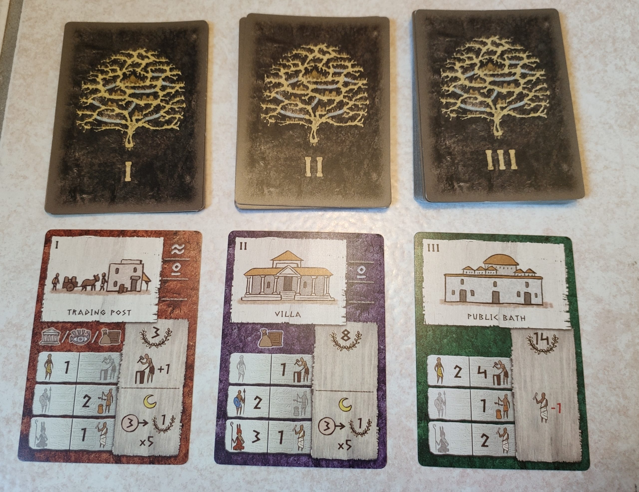 Le jeu en lui-même est très intéressant. La mécanique de draft tournante n’est pas nouvelle (Citadelles pour n’en citer qu’un) mais fonctionne très bien ici. On voit sa civilisation se développer au fur et à mesure des 3 âges, on voit apparaître des bâtiments + développés et + performants au cours de la partie, et le rythme s’accélère lors du 3ème âge qui achève de valider votre stratégie, ou vous permet d’en poser une nouvelle, mais attention! La moindre erreur lors de ce dernier âge se paie cher!