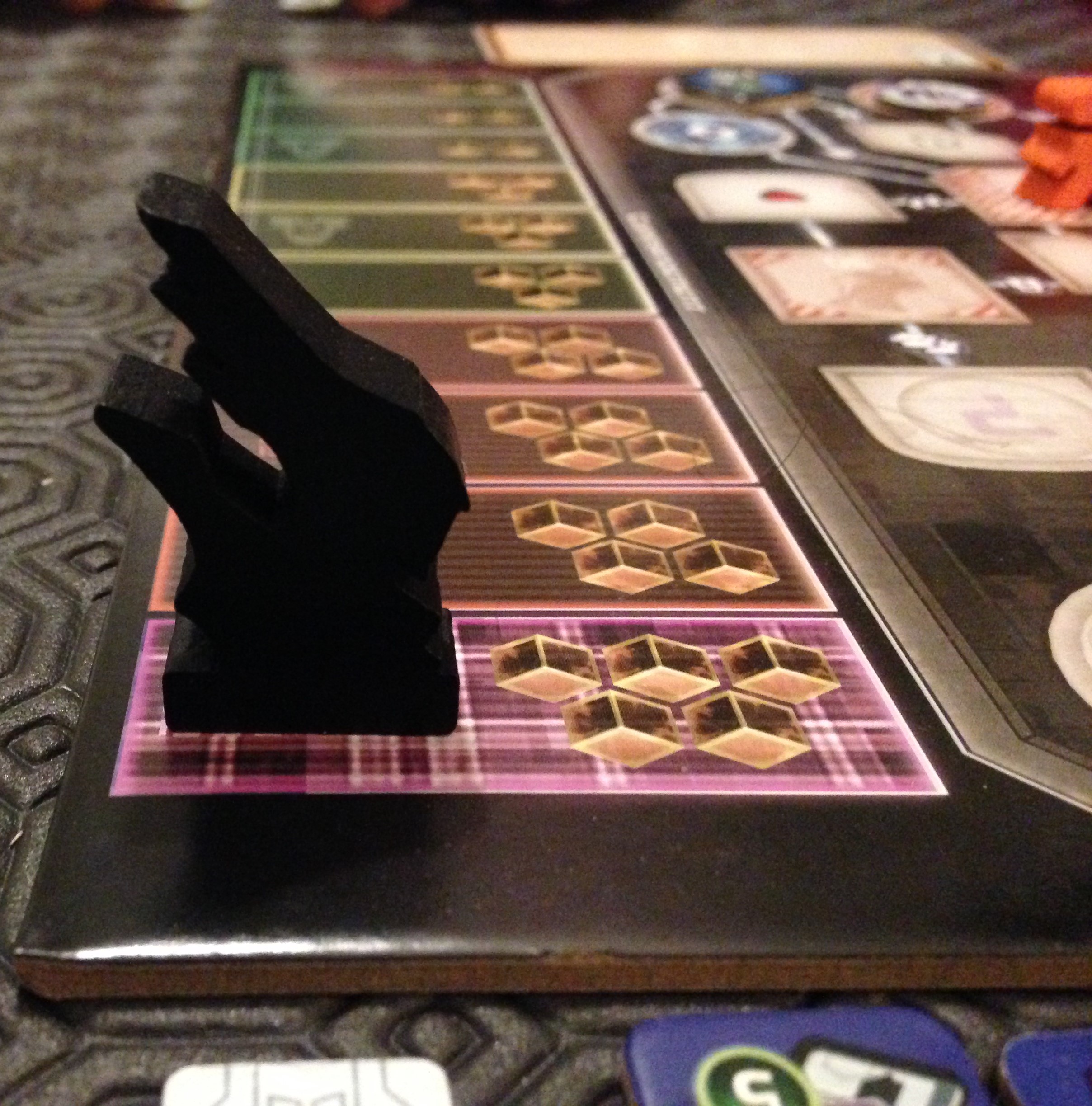 Dorénavant, les cubes noirs viennent sur la carte Machination remplir les cases des différentes phases. Dès qu’une phase est complétée avec le nombre de cubes noirs adéquat, son effet se déclenche. Les cubes noirs piochés ensuite sont ajoutés à la phase 2, et ainsi de suite.