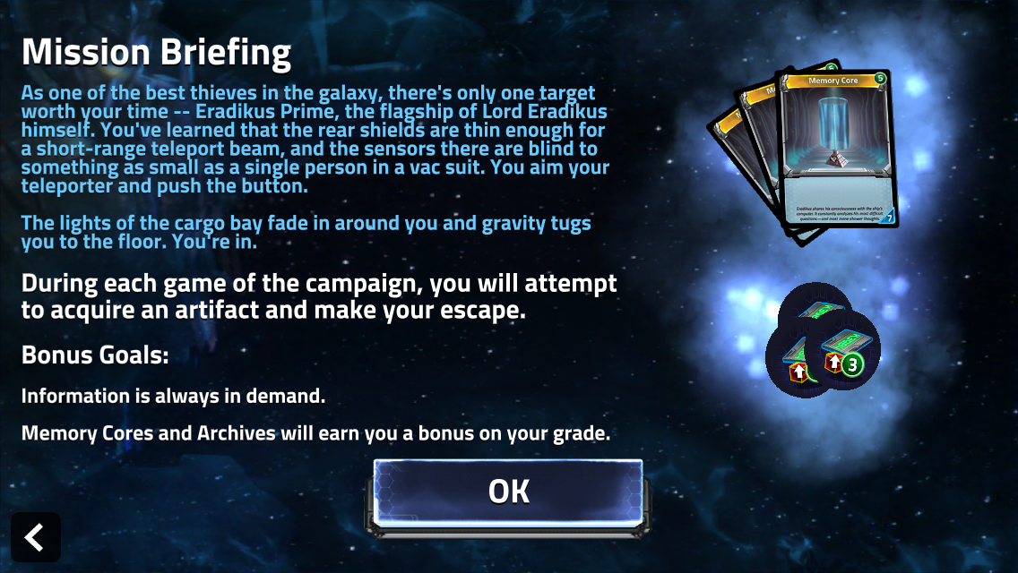 Donc on incarne à nouveau des aventuriers voleurs qui vont s’infiltrer dans le vaisseau du terrible seigneur Eradikus, qui a conquis la galaxie et entreposé pas mal de bibelots très recherchés et faciles à revendre! A vous de constituer votre équipe en recrutant des alliés, choisir votre chemin dans les entrailles du vaisseau, pirater le centre de commande pour accéder à la salle aux trésors et s’enfuir avec les Artefacts!