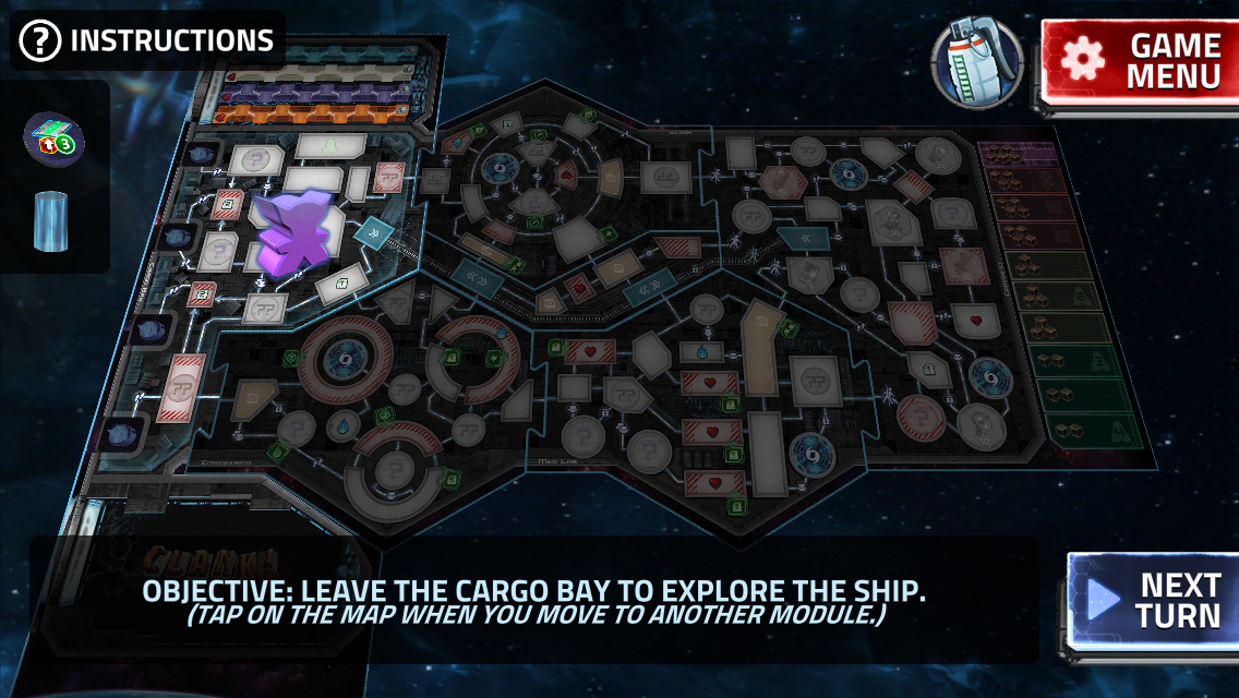 Pour mener à bien votre expédition il vous faudra accéder à la salle du coffre. Pour cela, vous devez pirater le centre de commandes en disposant vos 2 cubes de data dans 2 ports de données différents dans le vaisseau. Une fois fait, vous pouvez accéder à la salle des trophées et en voler 1! Tous les joueurs devront décrypter le code pour y accéder, et pas seulement 1 joueur pour tous les autres! Ce n’est pas bien compliqué mais il faut l’intégrer dans son trajet dans le vaisseau.