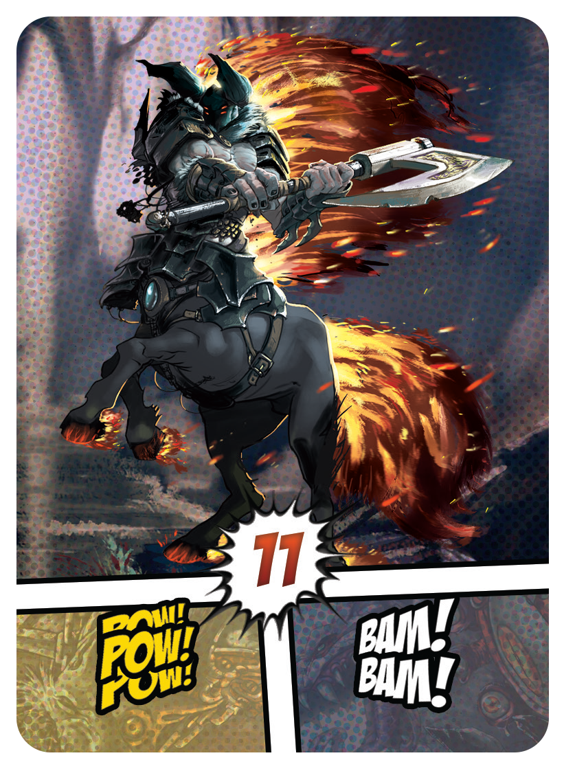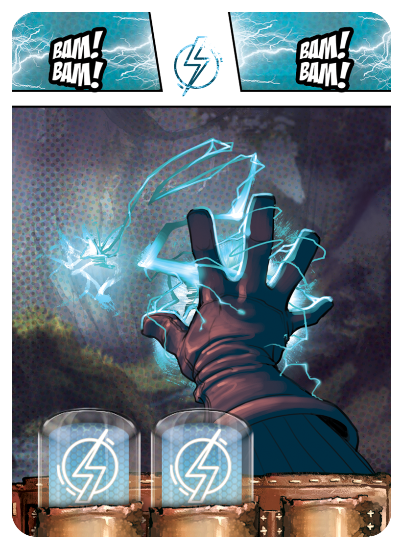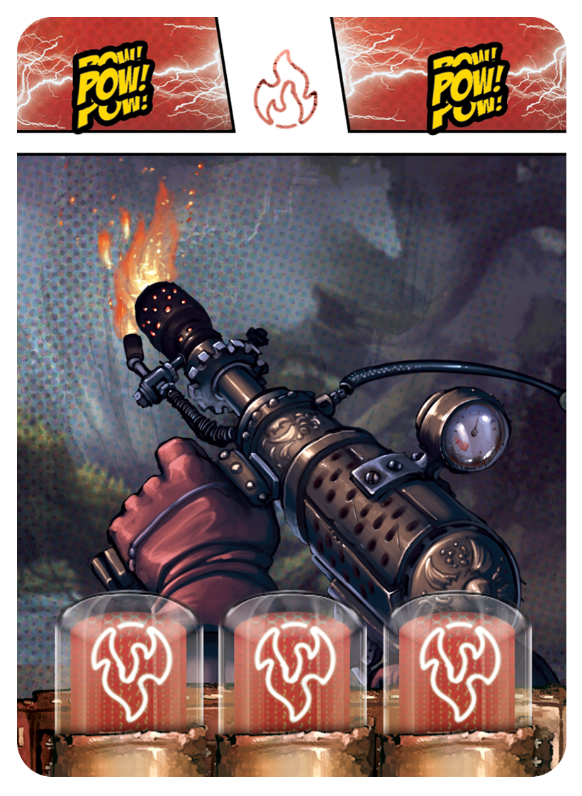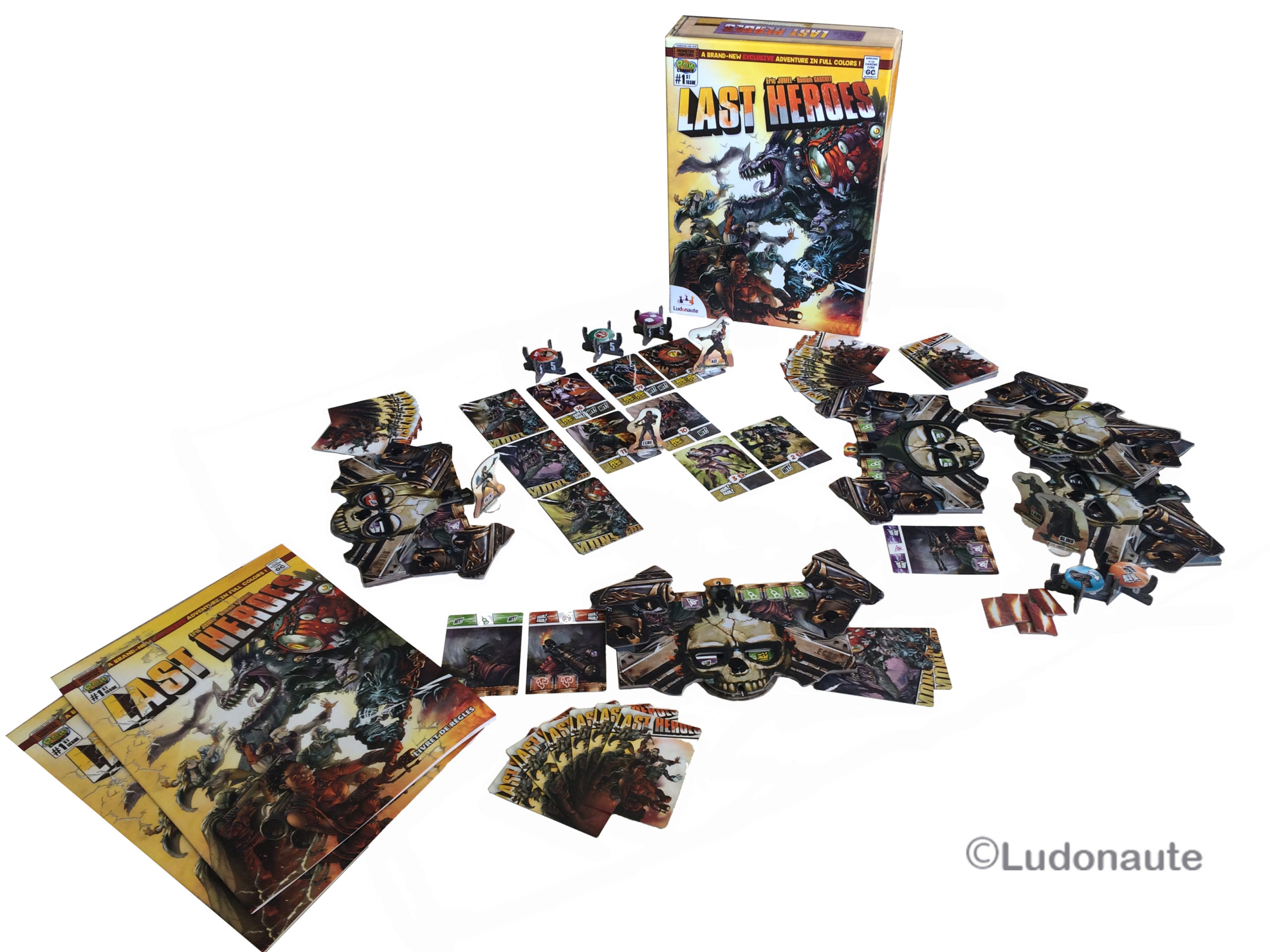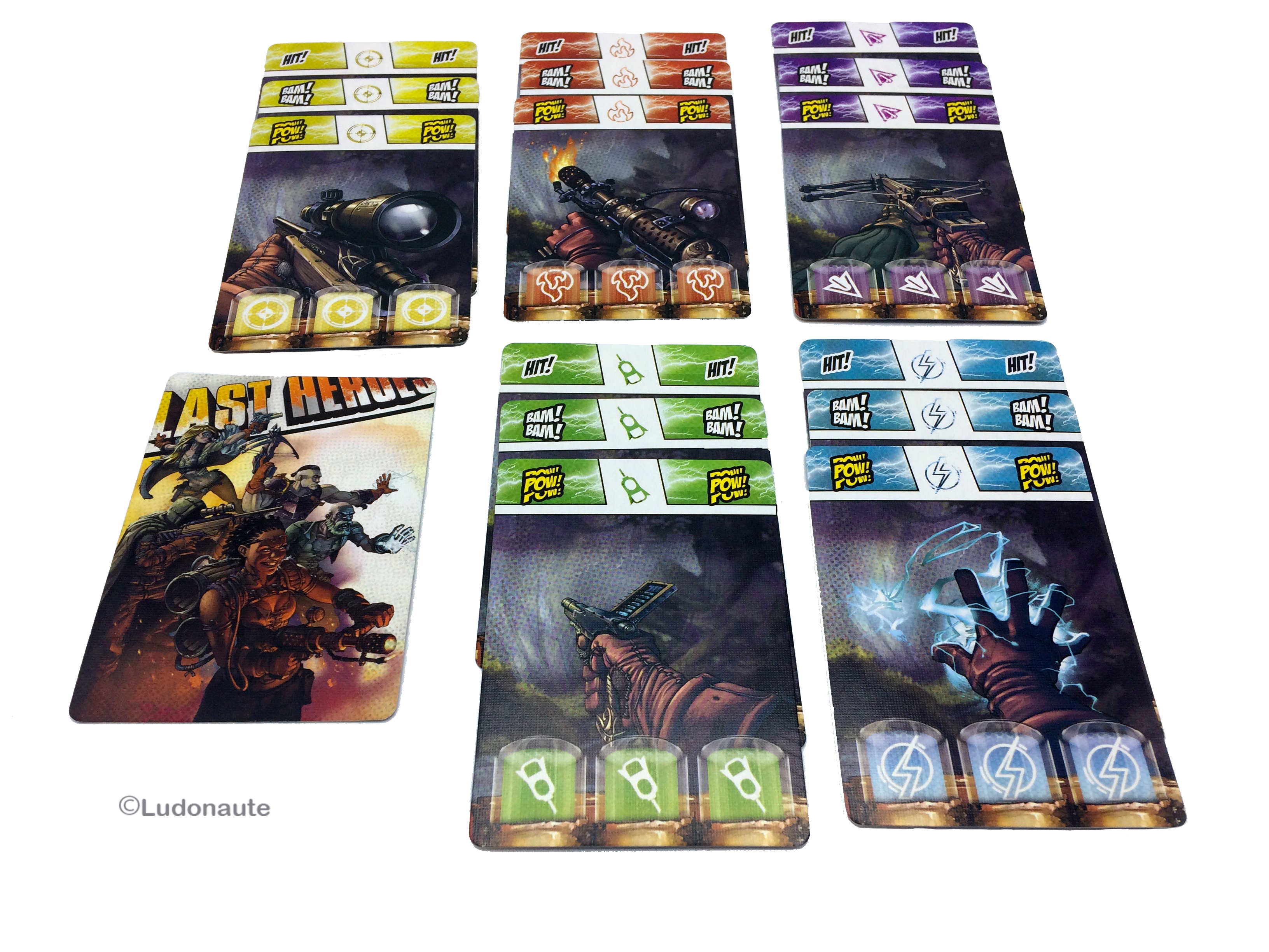 Last Heroes vous propose un matériel d’une qualité rare, avec des plateaux manipulables très originaux et fonctionnels. Véritables « acteurs » de la partie, vous glissez vos cartes munitions dans les emplacements, et rabaisser les armes positionnées sur les côtés, pour recouvrir les cartes au fur et à mesure que vous utilisez des munitions. Très ingénieux et immersif! Les illustrations très inspirées comics américains font mouche, et les règles sont rédigées et mises en page de façon à se que vous ayez l’impression de lire un comics. Chapeau les artistes!