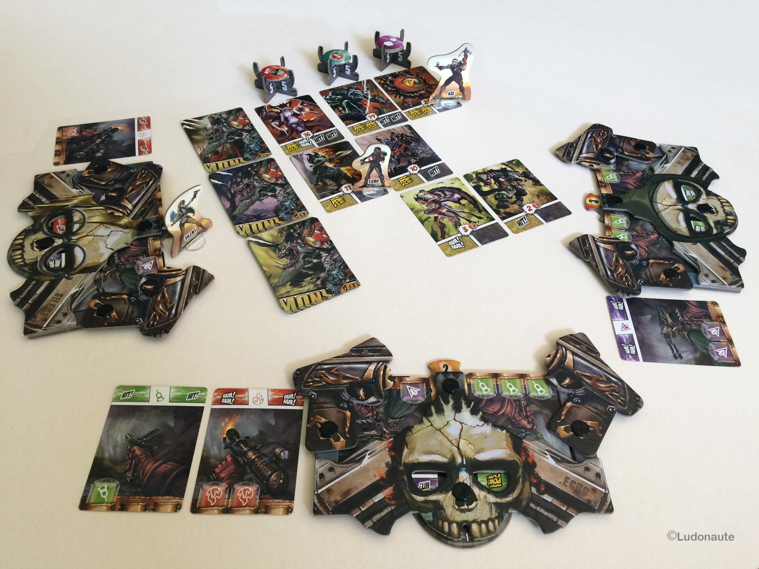 - placez une carte à côté de votre plateau, et vous aurez une arme chargée pour dégommer les monstres! Pour cela il vous faudra utiliser les munitions de votre plateau, ou de celui de vos collègues afin de la charger.