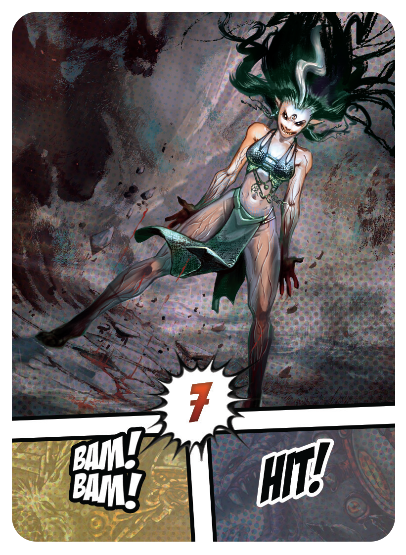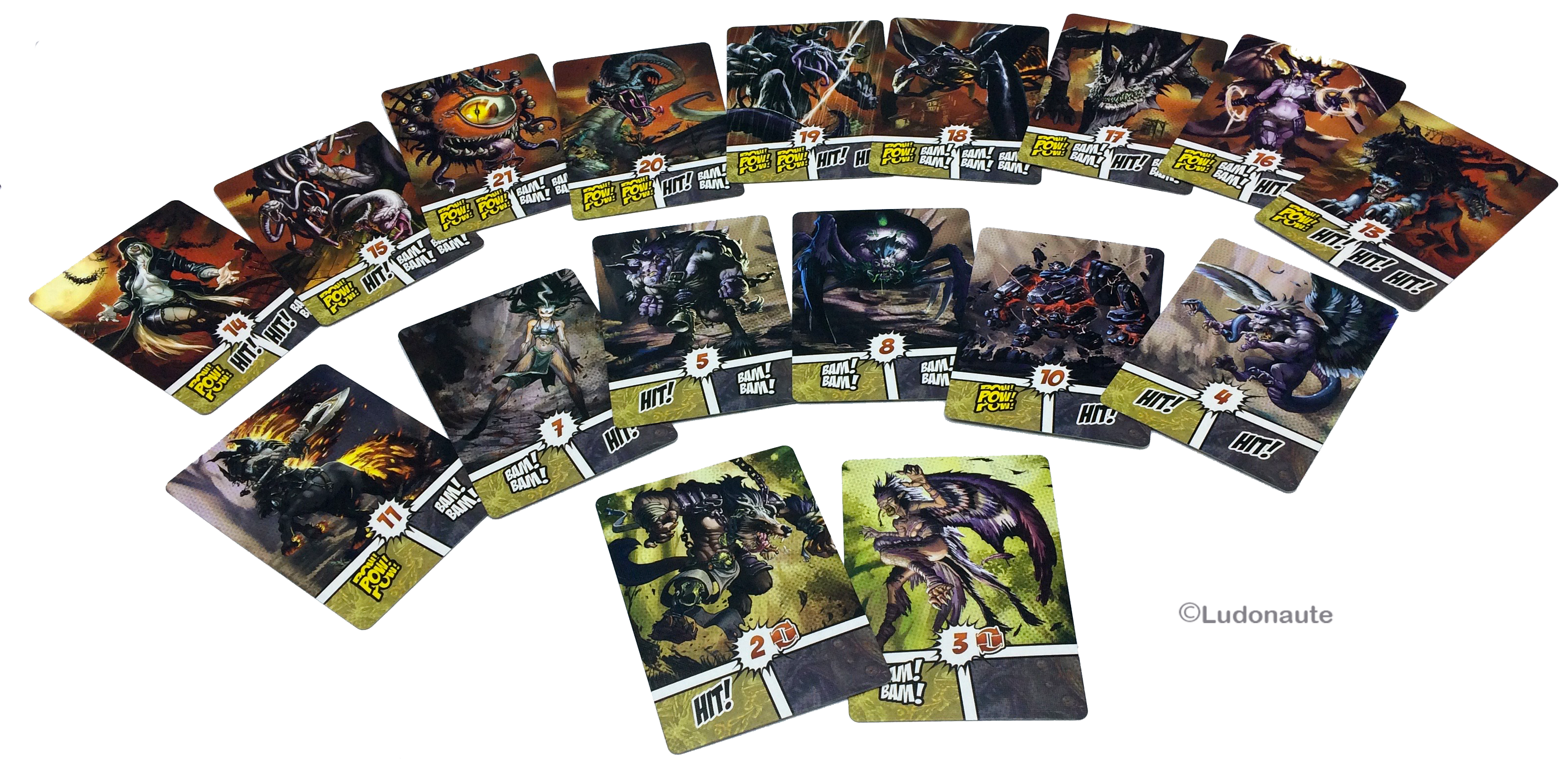 Le jeu est composé de cartes représentant les monstres de différents niveaux. Elles sont disposées en colonnes avec les monstres de rang 1 en bas, de rang 2 au milieu et 3 pour finir. Vous devrez attaquer et vaincre ses monstres pour remonter tout en haut d’une colonne et récupérer ainsi des artefacts, mais surtout pour tuer les monstres de niveau 3 rapportant le + de points de victoire PV. Pour vaincre les monstres, il vous faut des armes infligeant des dégâts du même type que le monstre.
