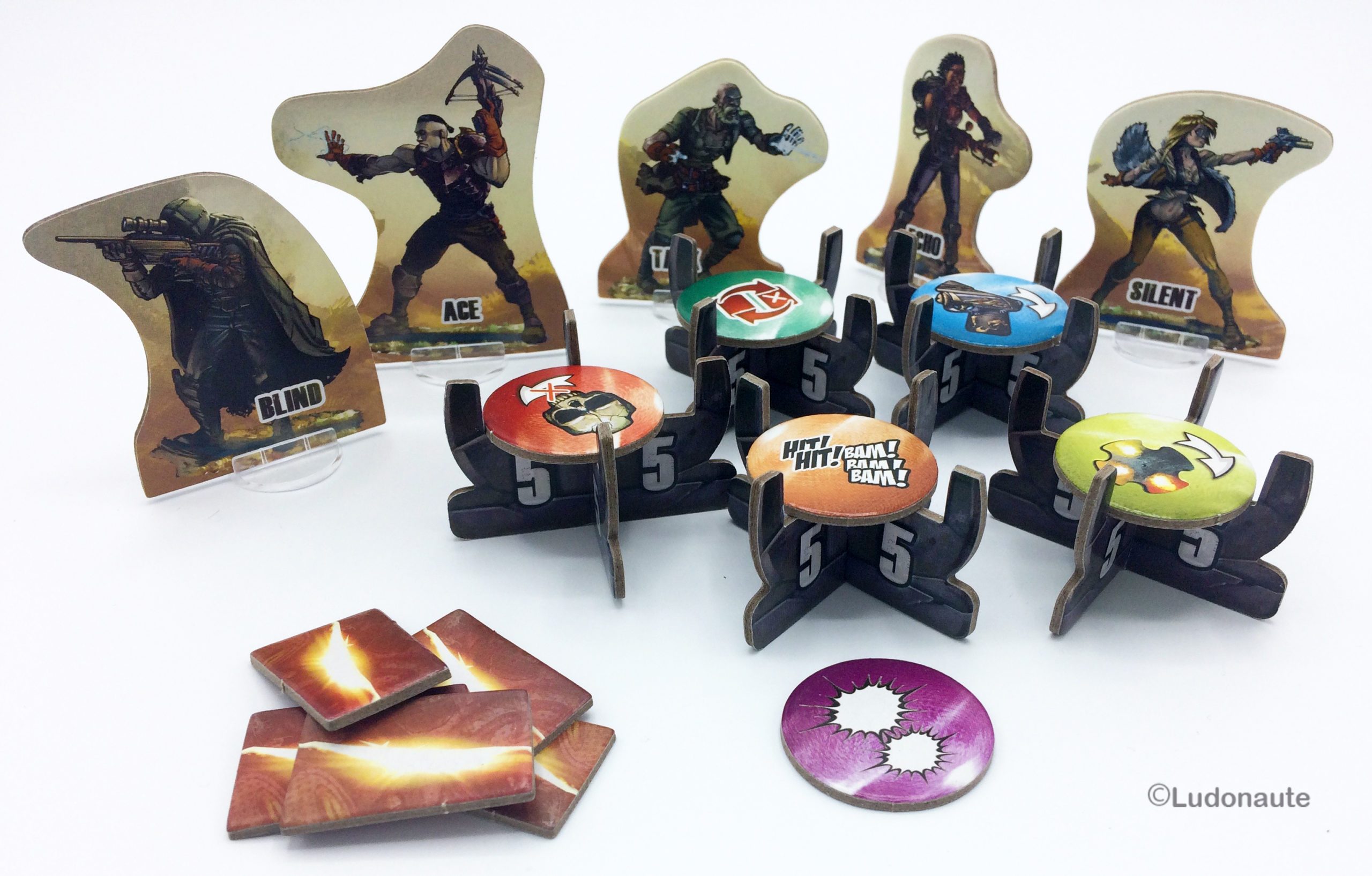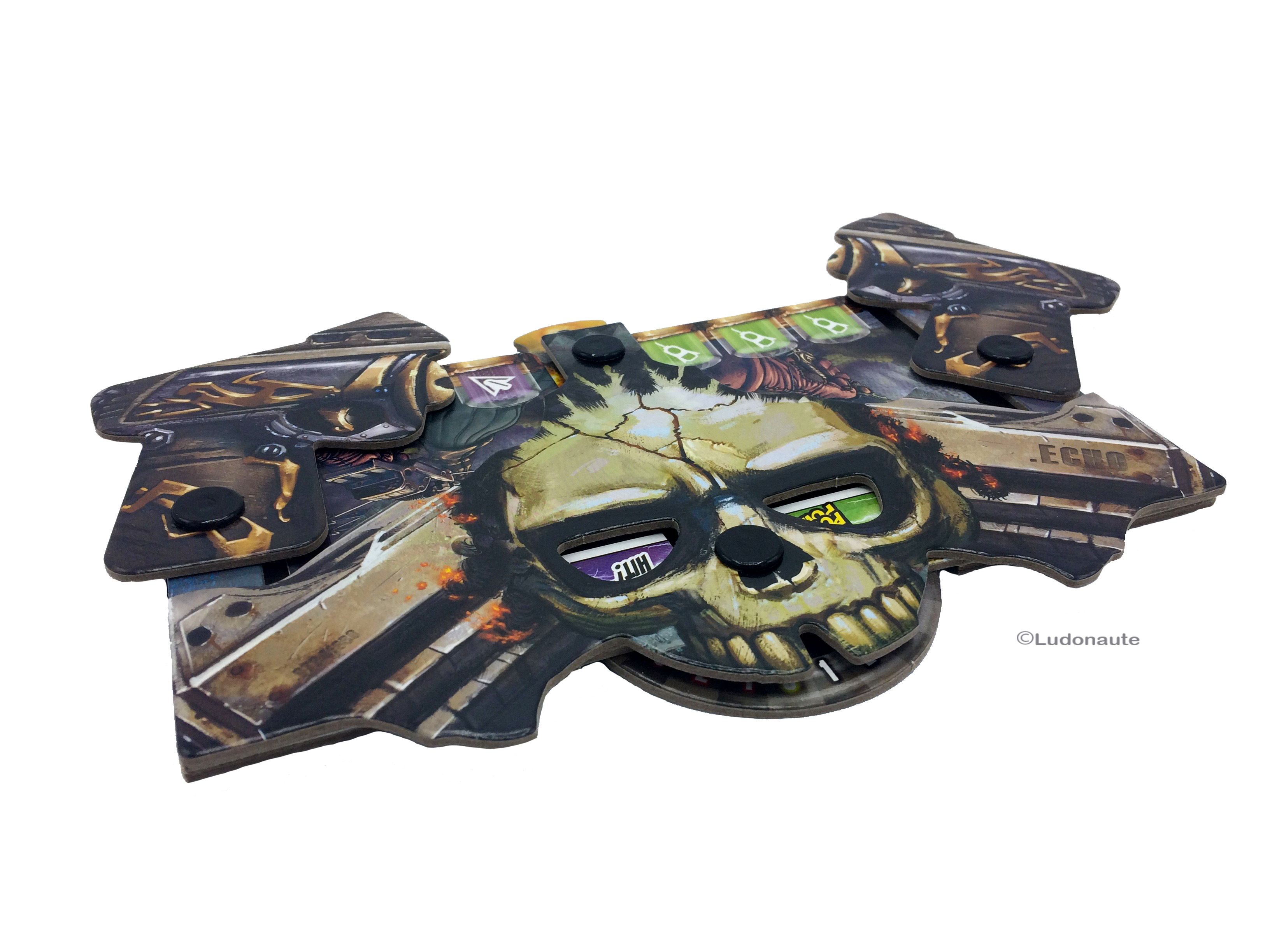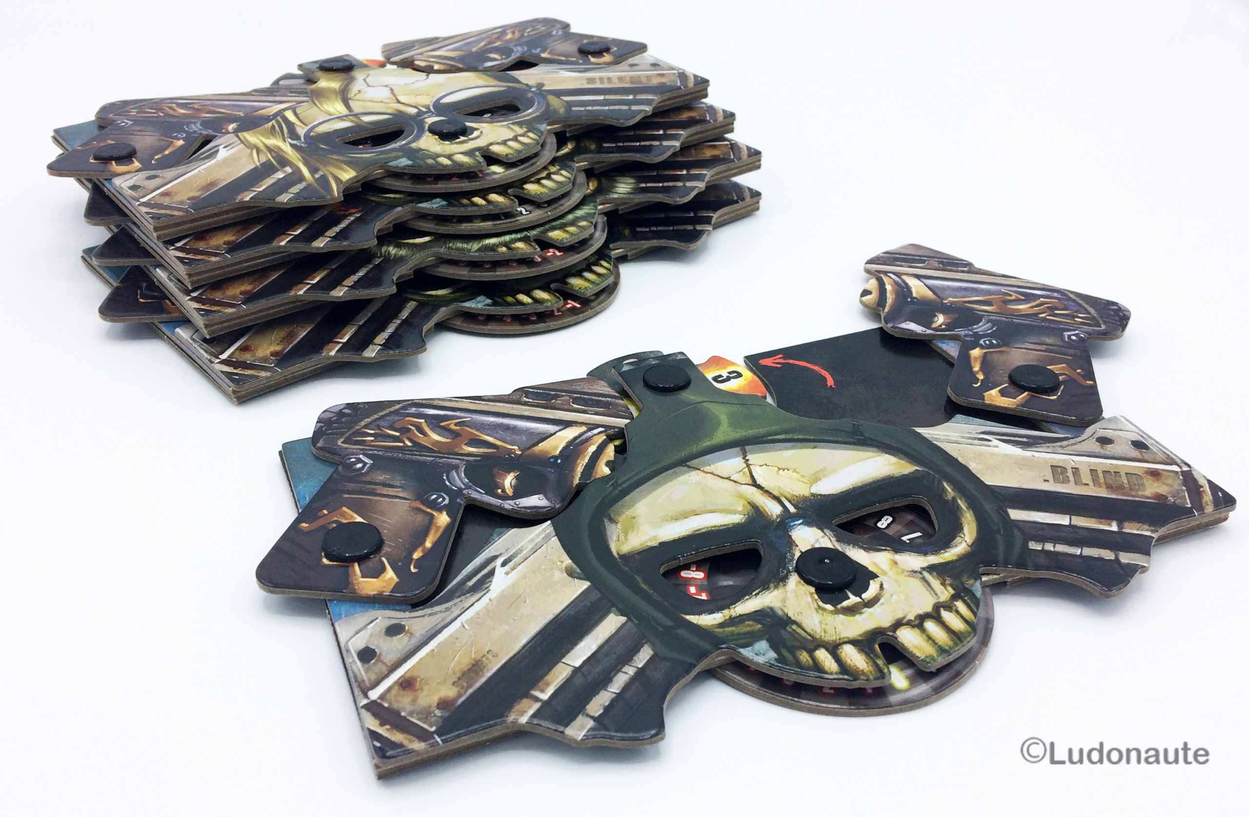 Vous aurez à votre disposition un superbe plateau de jeu manipulable. Des cartes représentant des armes lorsqu’elles sont posées dans un certain sens, et des munitions lorsque vous les utilisez dans l’autre sens, constituent votre main pour la partie.
