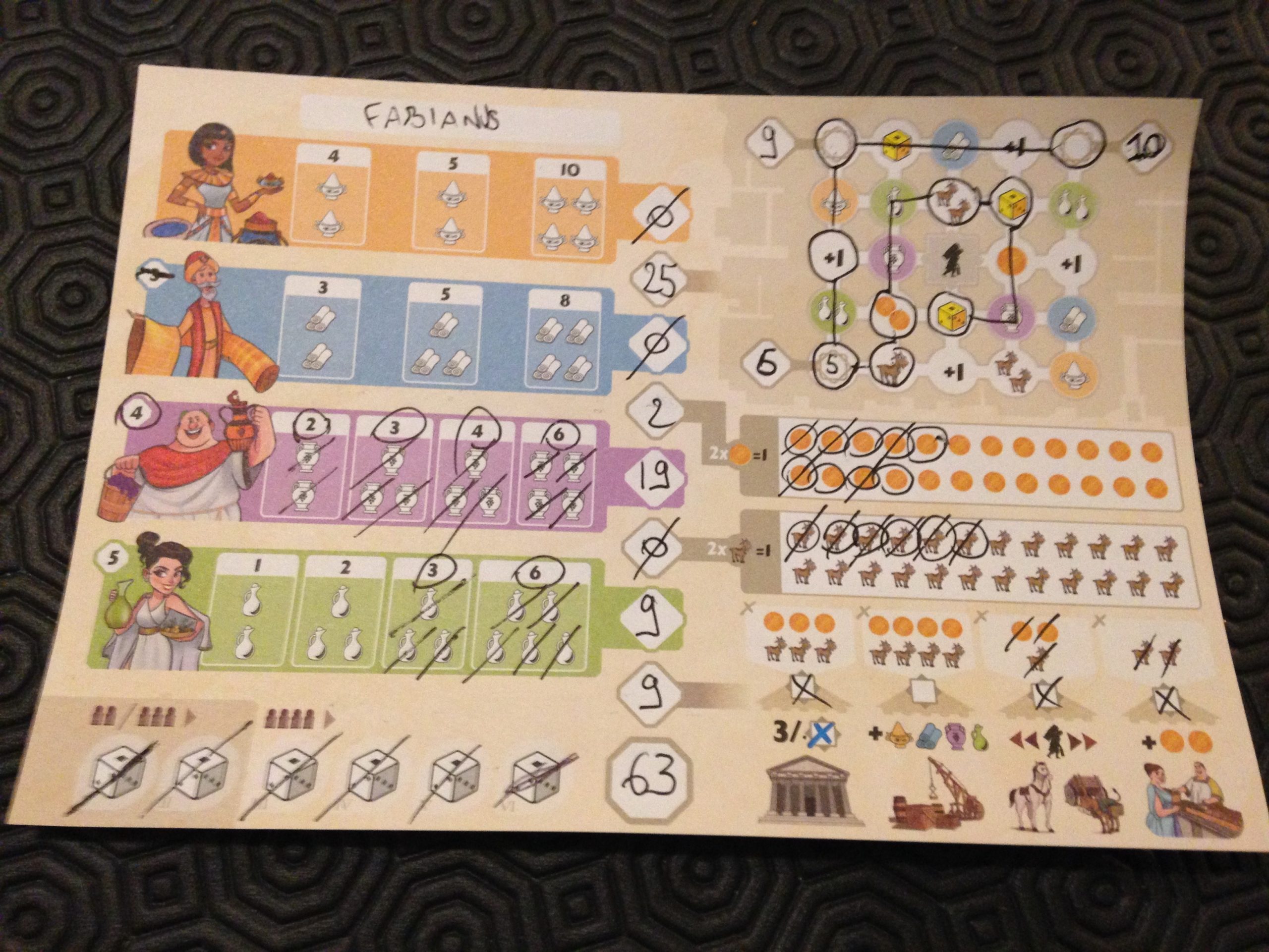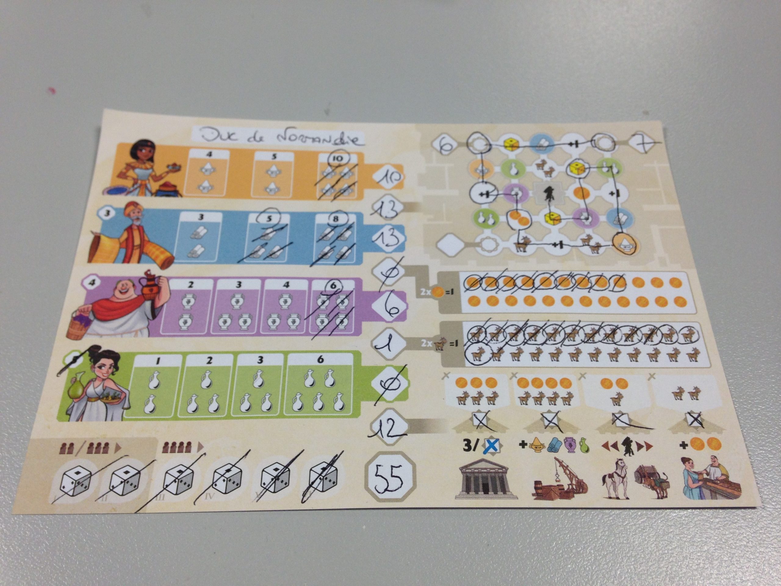 L’intendant au marché. Sur la droite du plateau se situe le marché qui ressemble à un labyrinthe. Plutôt que de faire l’action d’un quartier, on peut prendre n’importe quel groupe de dés sur le port, et déplacer son intendant d’autant de cases que la valeur d’un des dés pris. Ici c’est donc la valeur des dés pris qui compte. On dessine un chemin sur le marché puis on entoure le symbole d’arrivée, et on bénéficie de l’effet de ce symbole. On pourra récupérer de l’or, des chèvres, rayer un symbole dans l’un de ses quartiers, etc… Petite précision, il n’est pas permis de repasser par un symbole déjà traversé ou entouré. Attention donc à bien réfléchir à son cheminement.