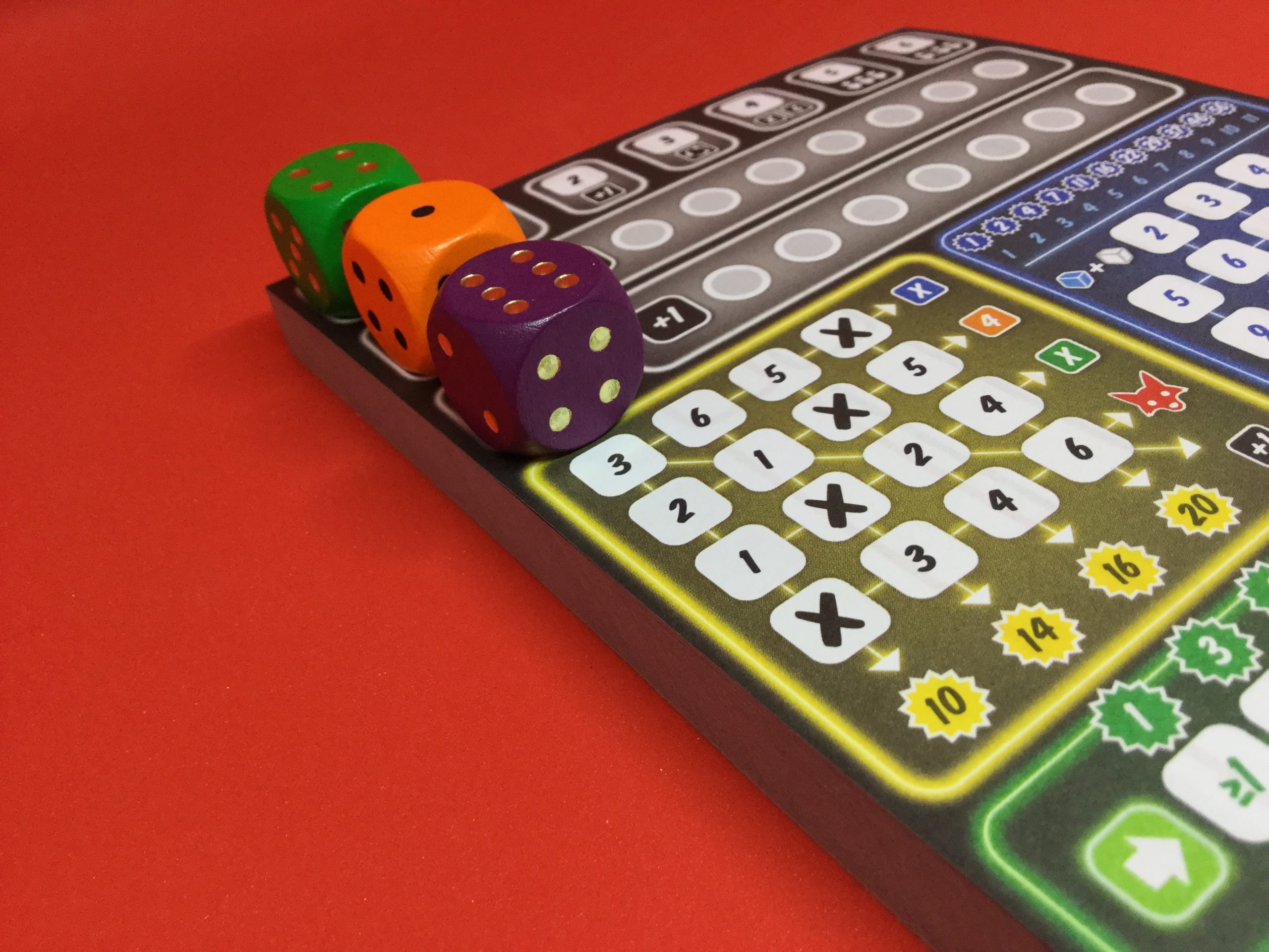 Il y a 5 dés à manipuler et à sélectionner pour ensuite placer sur la feuille de score les nombres de ces dés, ou cocher les cases. il y a 5 dés de couleurs différentes, pour les 5 zones de la feuille de score. Le 6ème dé blanc fait office de joker.