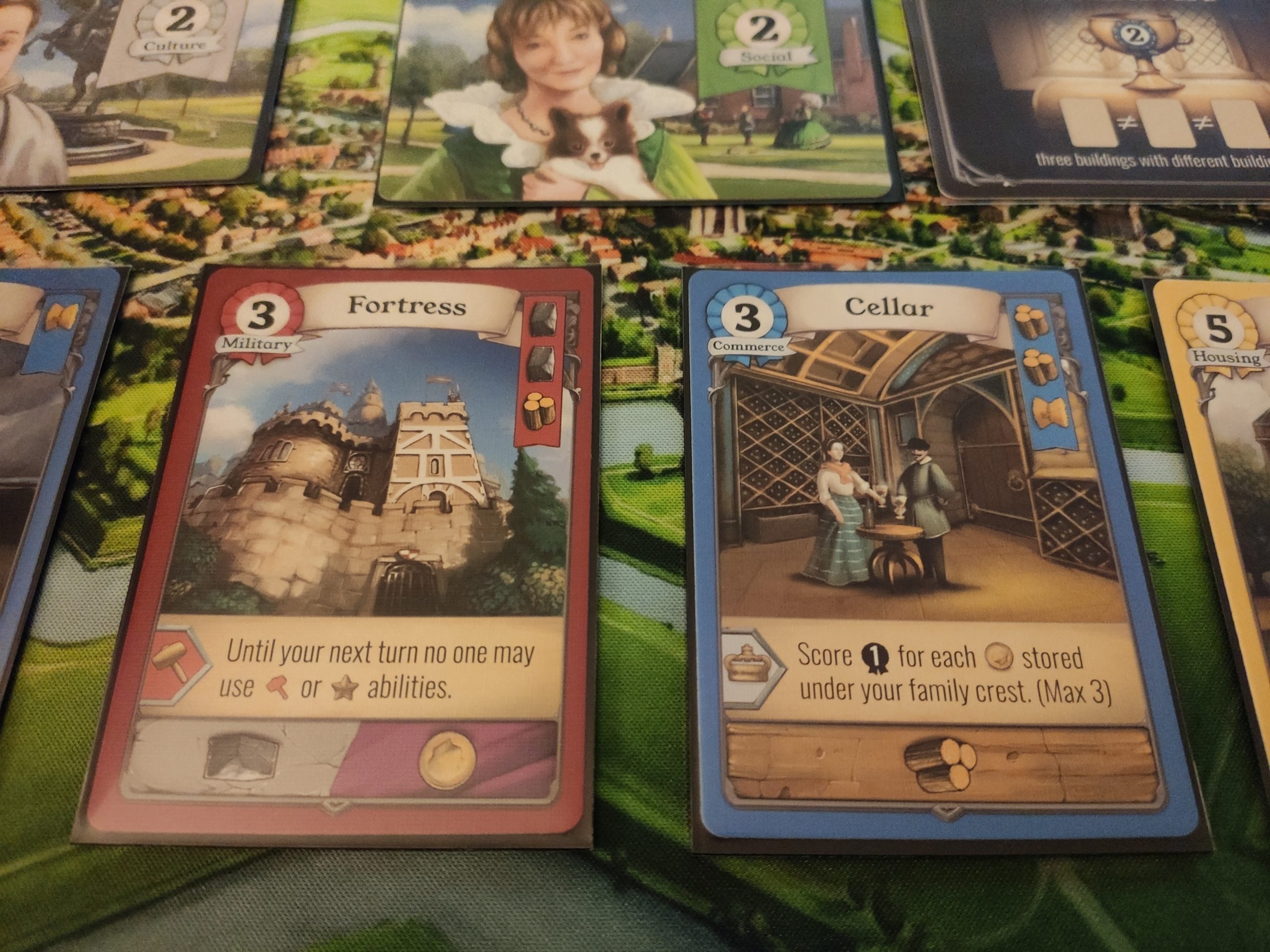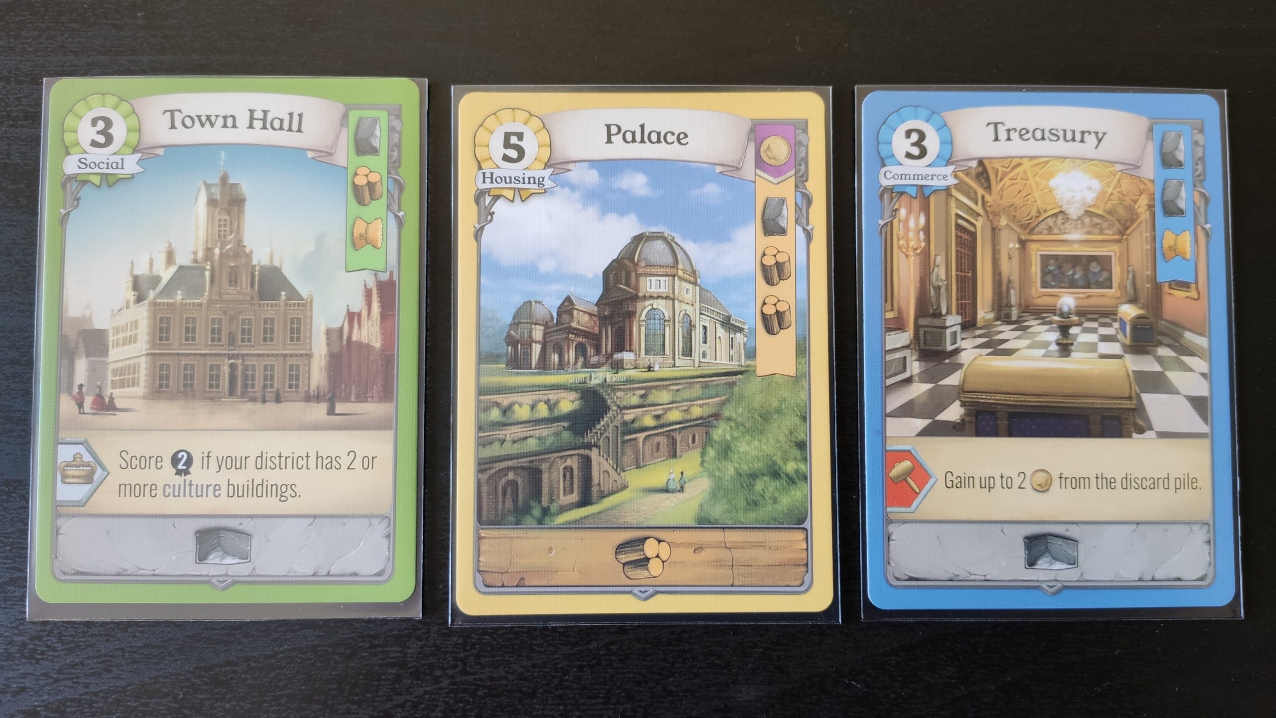 Les cartes bâtiments sont la base du jeu, et sont de plusieurs types (militaire, commerce, culture, logement et social). Elles rapportent des PV, ont un coût de construction, et parfois une capacité que l’on pourra utiliser dès qu’elles seront construites, ou + tard durant la partie.