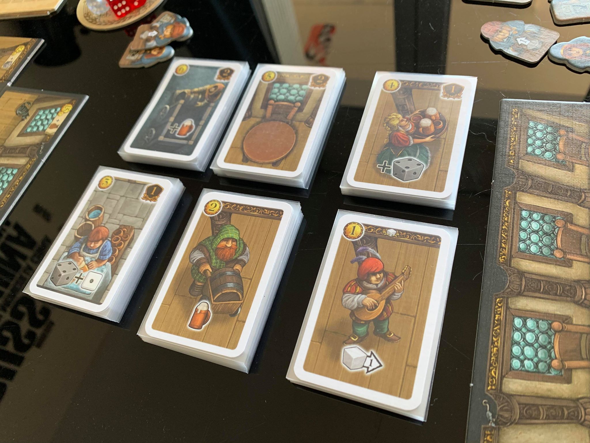 Pour commencer un tour de jeu chaque joueur va jouer les cartes de son deck de départ jusqu’à remplir toutes les tables de sa taverne. La chance est présente à ce moment de la partie mais en enchaînant les tours vous pourrez la maîtriser en construisant bien votre deck.