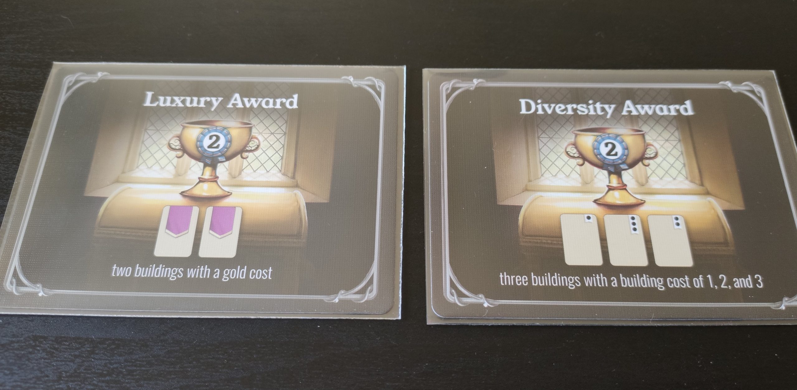 Donc chacun construit sa ville dans son coin, essaie de mettre en place sa stratégie puisqu’il faudra orienter vos constructions en fonction des différentes juges désignés pour la partie, et des récompenses disponibles. Les juges vous accordent 2 PV si vous êtes le joueur ayant le + de bâtiment de leur type, et les récompenses donnent aussi 2 PV au joueur qui remplit leurs conditions le + rapidement possible (par exemple, 3 bâtiments construits avec le même type de capacité, immédiate, à déclencher ou en fin de partie).