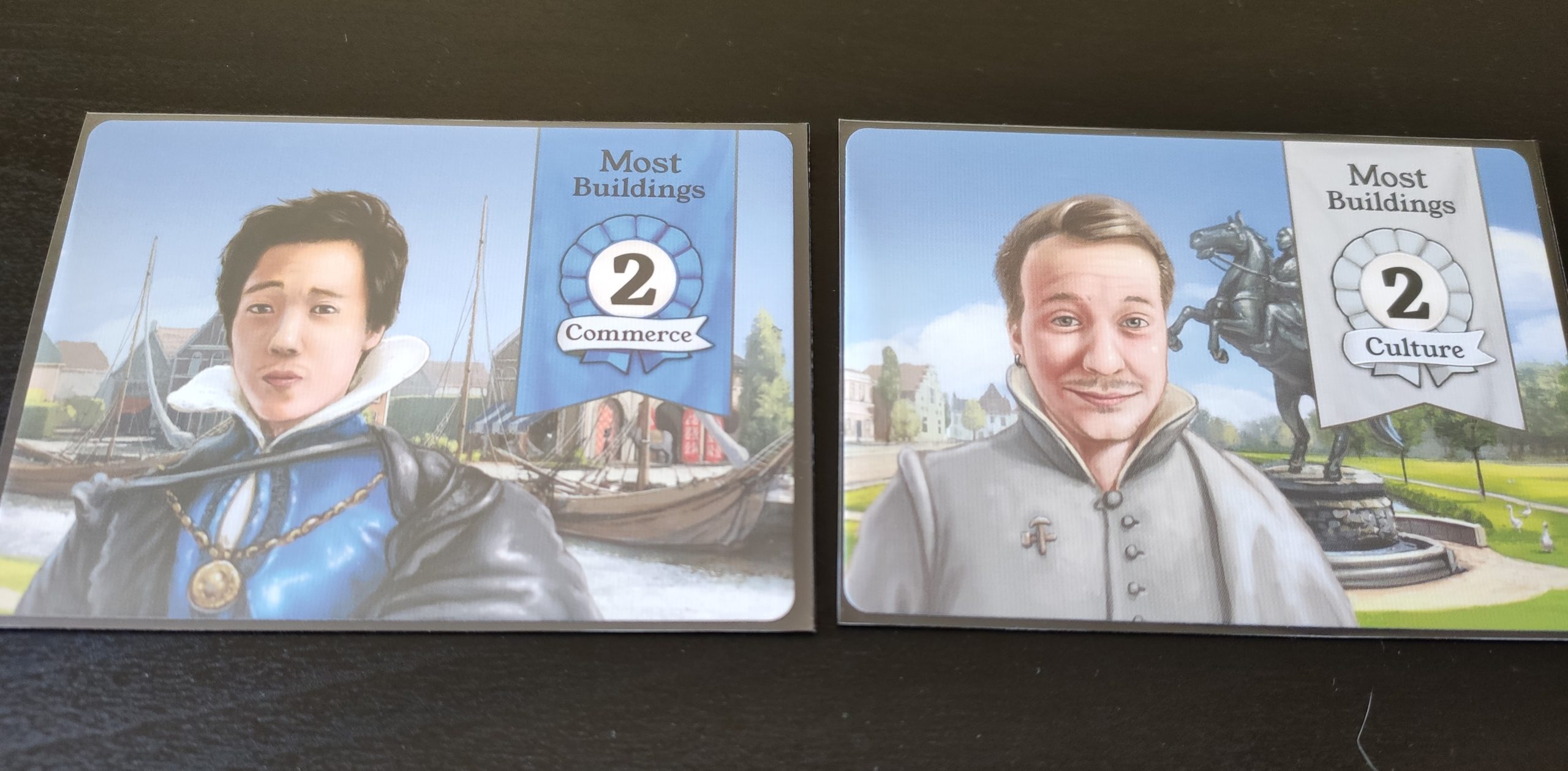 Il y a plusieurs cartes juges qui, à la fin de la partie, donneront des PV au(x) joueur(s) ayant remplis les critères d’obtention. Il s’agit d’avoir le + de bâtiments de tel ou tel type.
