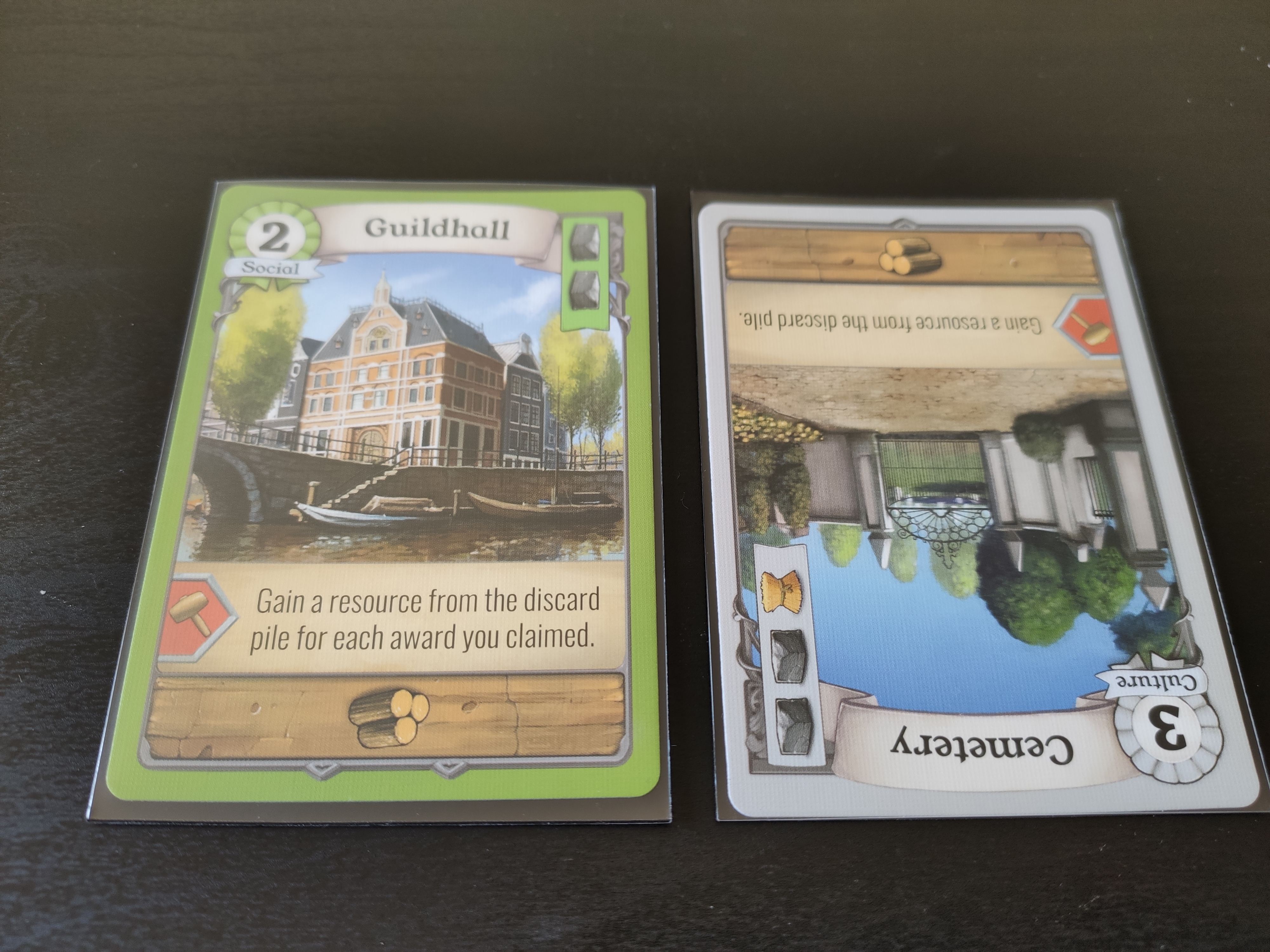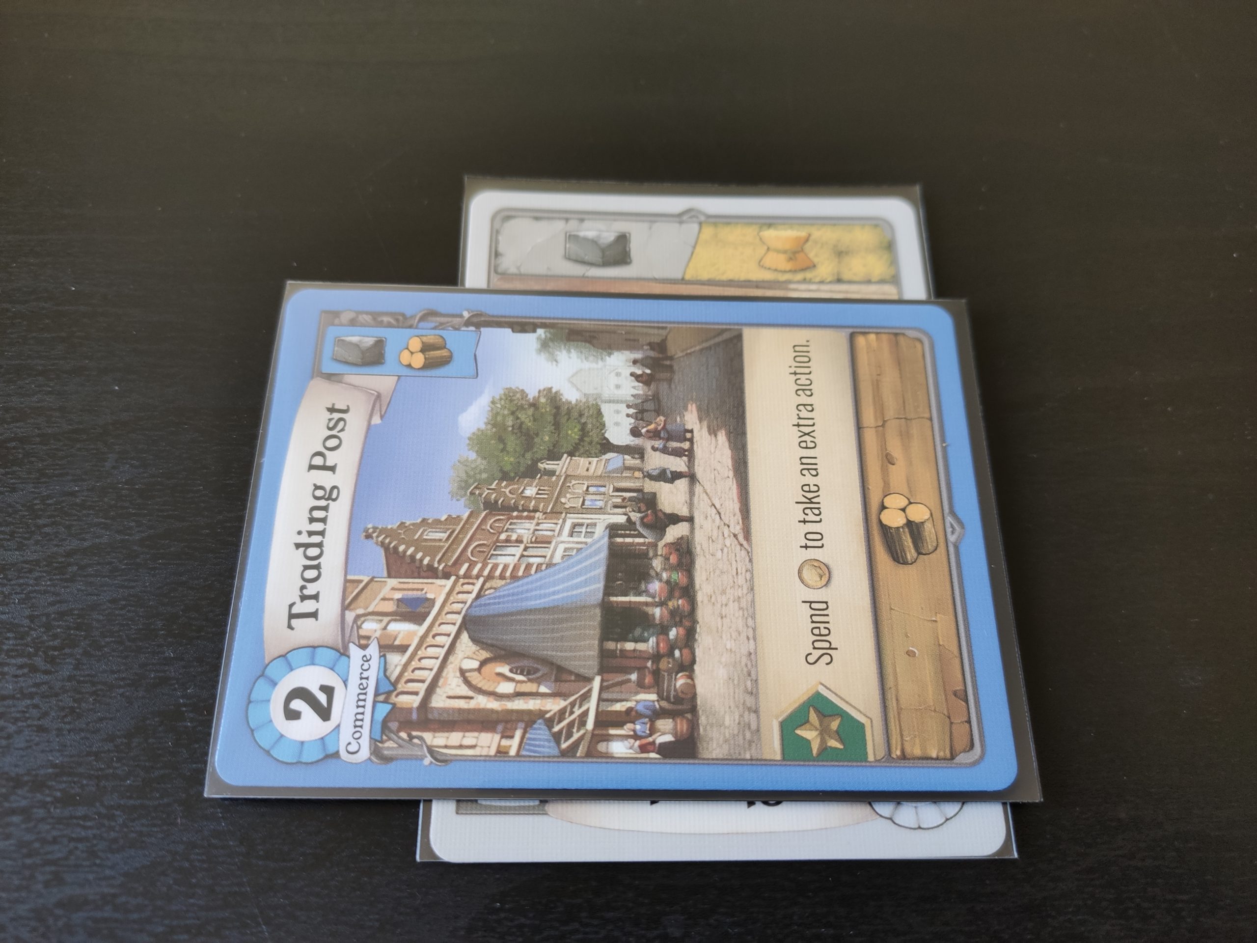 Une fois qu’une carte bâtiment a toutes les ressources nécessaires placées derrière sa carte, elle est automatiquement construite. Le joueur ajoutera donc les PV de la carte en fin de partie, et bénéficie si c’est le cas d’une capacité de la carte. Capacité immédiate (gagner 1 ressource de la pile de défausse), à déclencher quand il le souhaite durant la partie (La prochaine construction que vous validez ce tour-ci coûte 1 ressource bois de moins), ou alors qui se déclenche au comptage des PV en fin de partie (gagnez 2 PV si votre ville contient 2 bâtiments Commerce ou +).