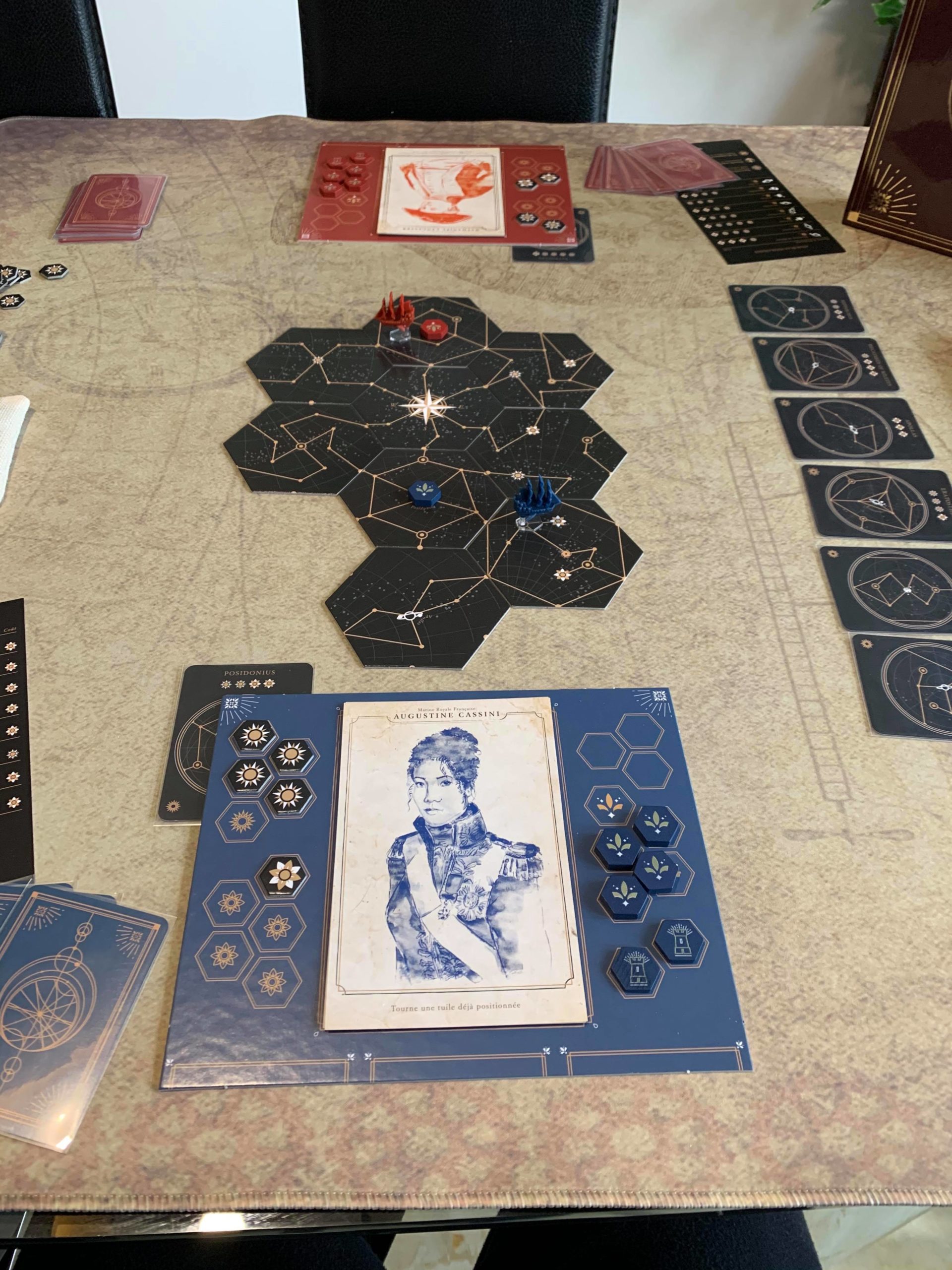 C’est ce qui frappe en premier, cette boite bordeaux avec les liserés dorés, sobre, élégante qui donne envie de l’ouvrir. L’intérieur n’a rien à envier à l’emballage, des bateaux sur socle, quelques cartes, des tuiles hexagonales représentant les constellations et les fiches des capitaines illustrées avec soin. Des plateaux joueurs et de jolis pions en bois illustrés viennent compléter le tout. A noter l’insert qui permet de franger sa boite verticalement comme horizontalement sans que tout ne vienne se mélanger avec en bonus l’insert indépendant pour les navires.