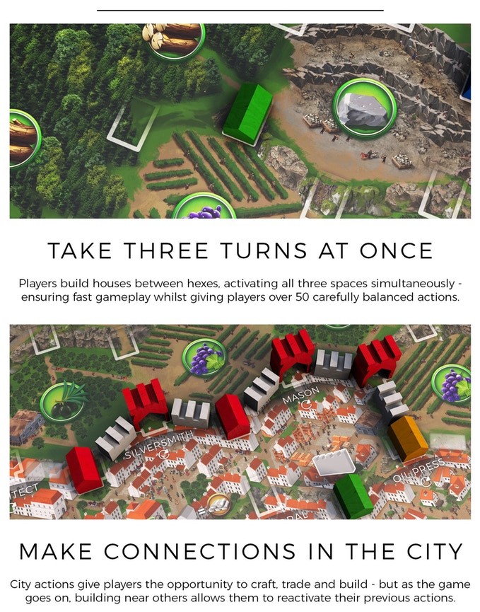 Dans ce jeu de placement d’ouvriers (ici des maisons), chaque joueur va devoir placer l’une de ses maisons sur la carte de la ville. La carte est divisée en régions rurales (qui produisent les ressources) et en régions urbaines permettant de produire les marchandises et d’y commercer.