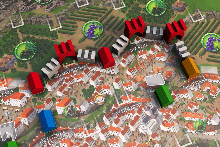 En ville, certaines régions permettent de fabriquer les marchandises comme l’orfèvre, l’établissement vinicole, le pressoir d’olives. D’autres comme le maçon et l’architecte permettent de construire des fortifications autour de la ville et des tours de défense. Le marché permet d’acquérir des cartes bateaux que l’on choisit sur un plateau consacré formant une rivière de cartes, que l’on réalimente au fur et à mesure. Ces bateaux permettent d’acheter d’autres marchandises comme les épices, le tissu etc… A la fin du jeu, en récupérant des cartes bonus dans la maison du gouverneur, ces marchandises pourront rapporter gros. Le quai permet de vendre vos marchandises fabriquées.