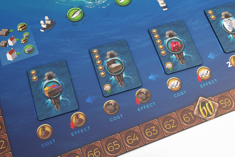 Il y a 7 ressources (poisson, bois, pierre, minerai, raisin et olives) que vous devrez récolter afin de produire 3 marchandises (vin, huile d’olive et argent) afin de les vendre.