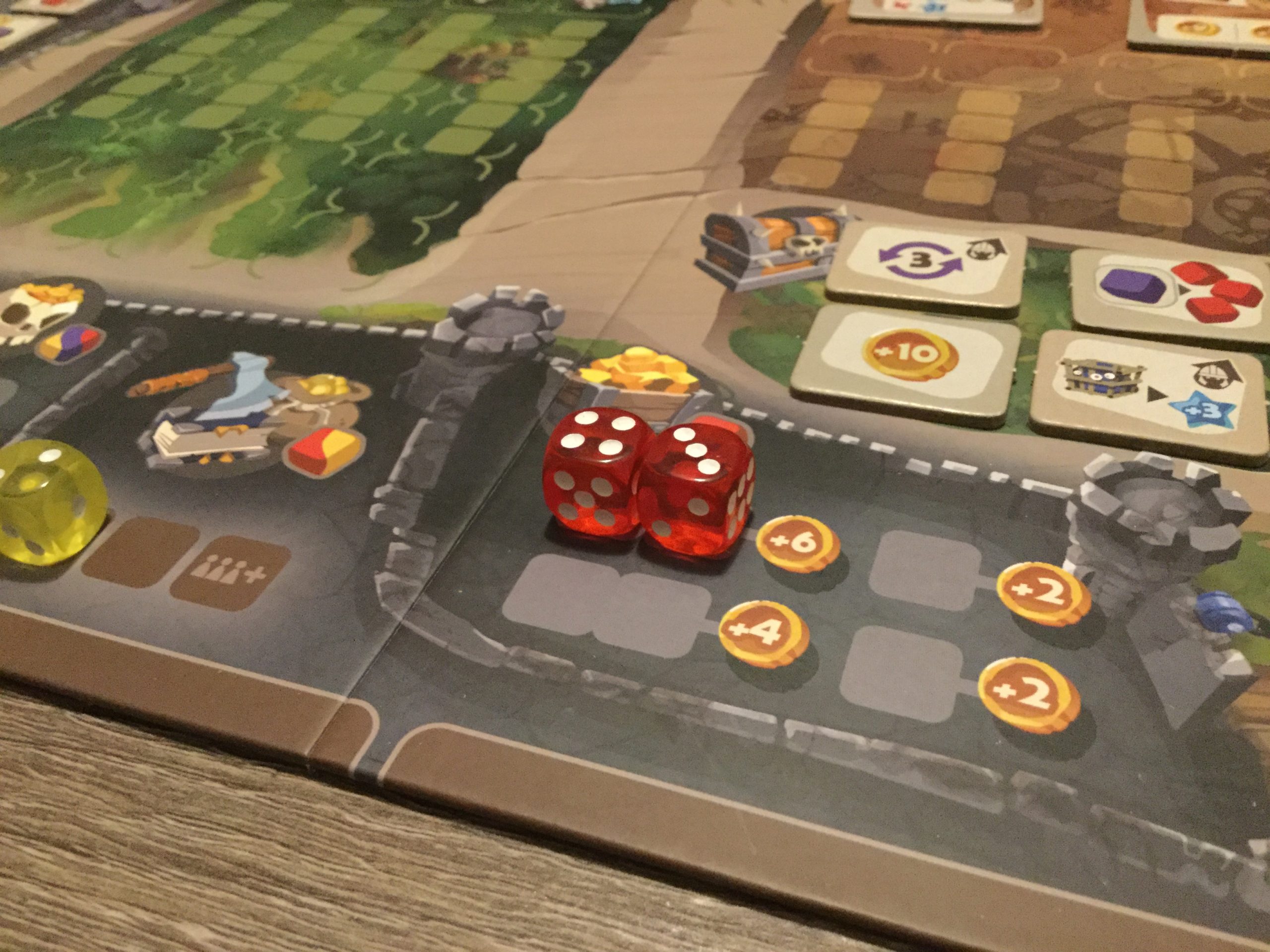 Que les allergiques à l’aléatoire se rassurent, le fait de gérer des brouettes de dés ne veut pas dire que tout se résout par un lancer de dés. Dans l’enceinte du château, seule importe la couleur de vos dés, vous ne les lancerez pas et le nombre du dé ne sera d’aucune importance (sauf les dés jaunes qui vous permettent de diminuer le coût d’une action).