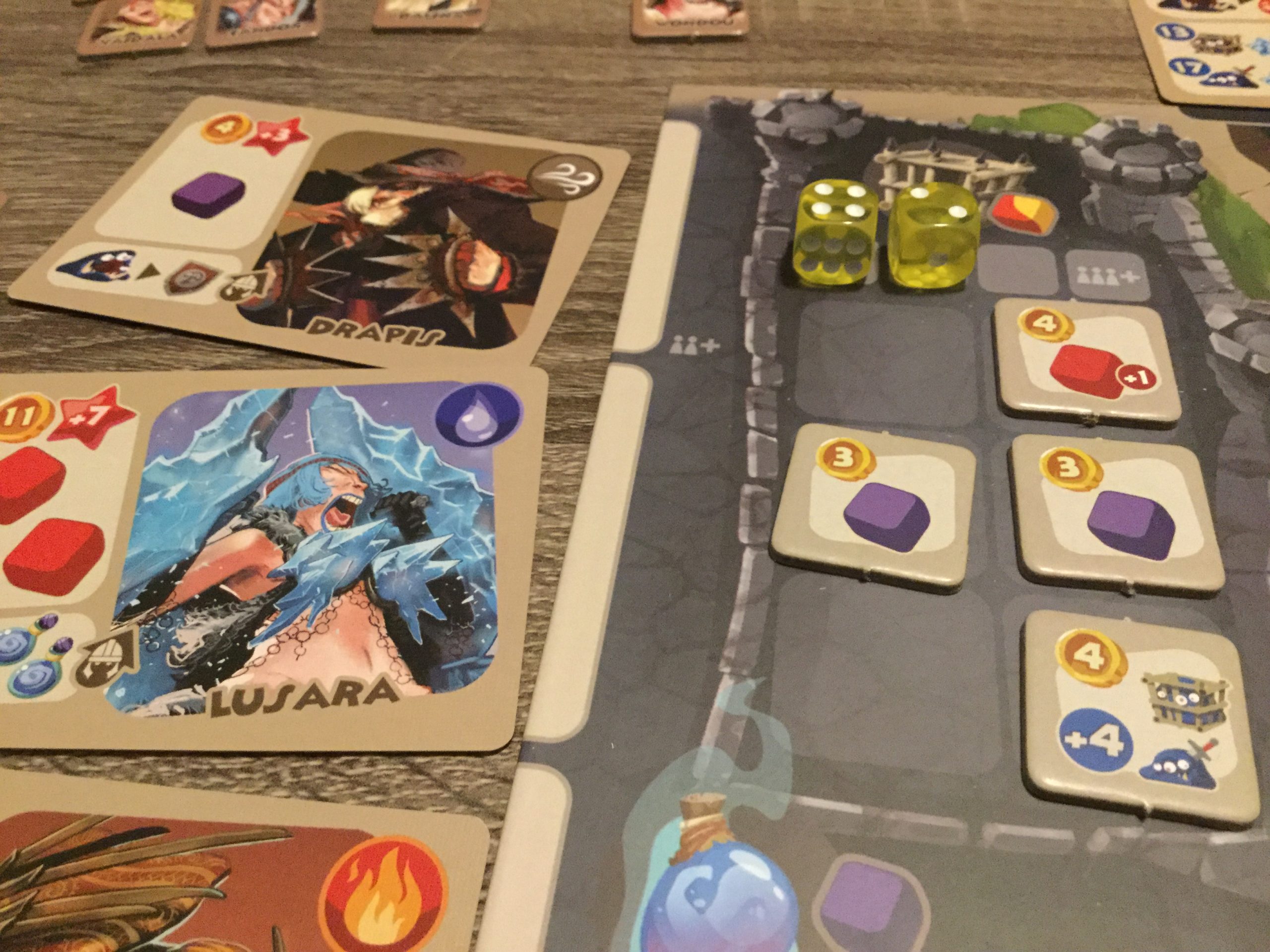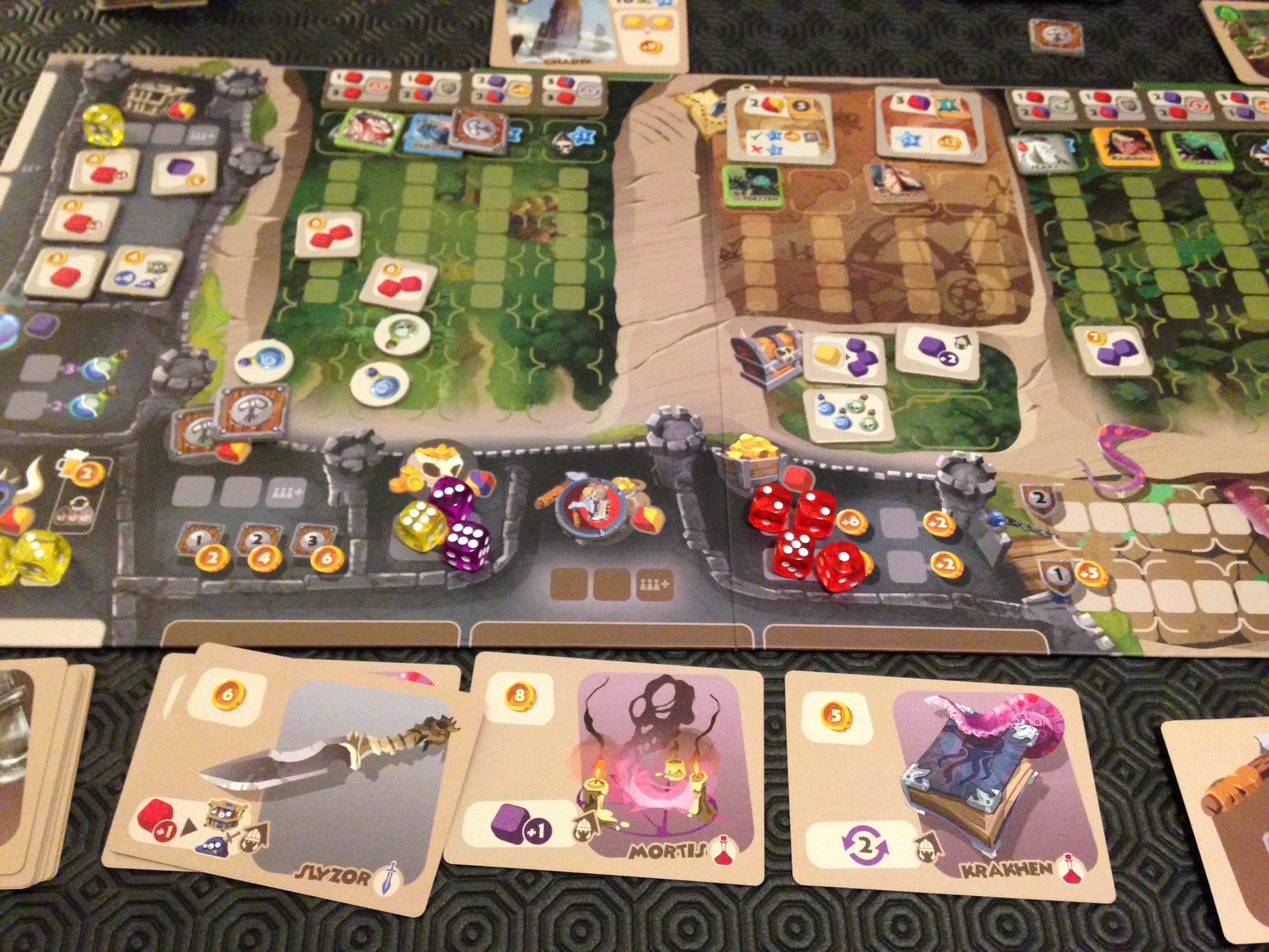A l’extérieur, une fois que vous avez placé un mercenaire, et que vous lui avez adjoint des dés et de l’équipement, la phase aventure vous permettra de résoudre le combat. Ici donc vous lancerez des dés et additionnerez les résultats pour tenter de capturer ou de tuer un monstre, ou de conquérir une région.