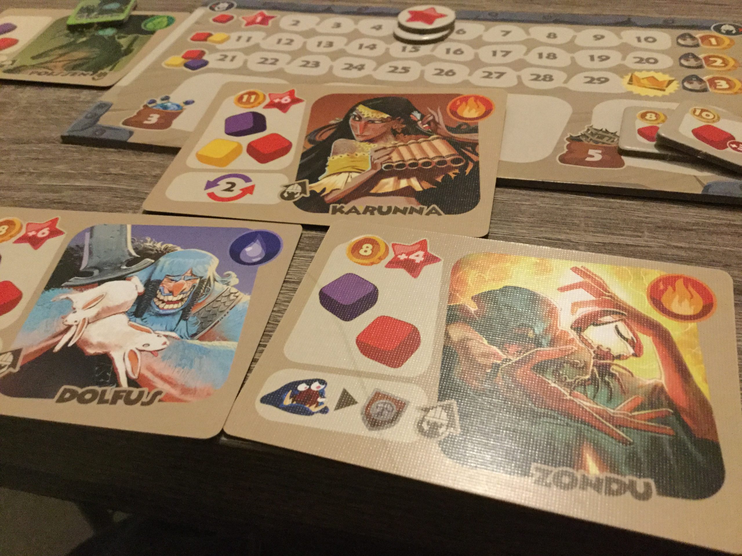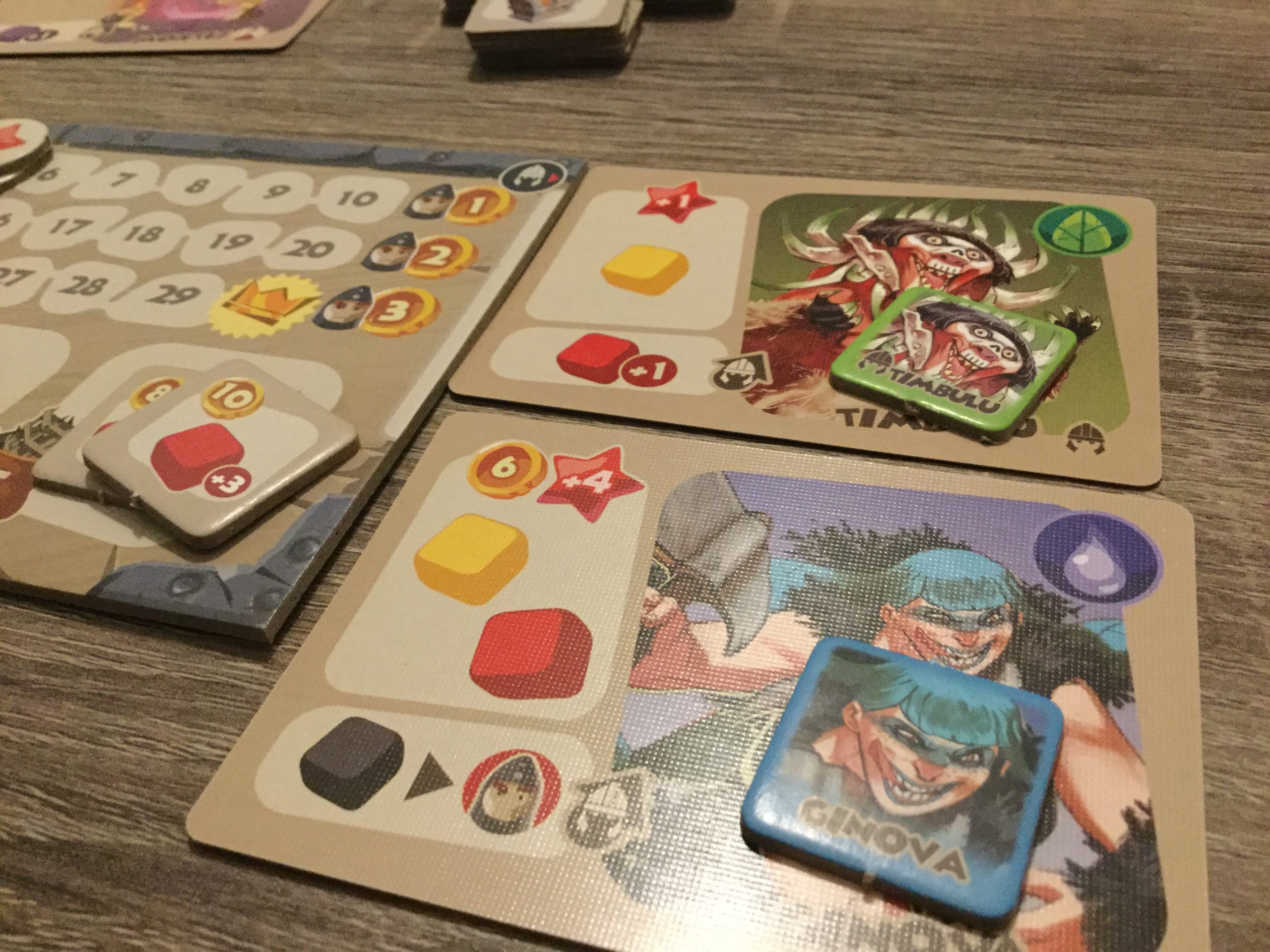 A la fin de la partie, on fait le décompte des points en prenant en compte les pièces gagnées avec les cartes décoration et les personnages.
