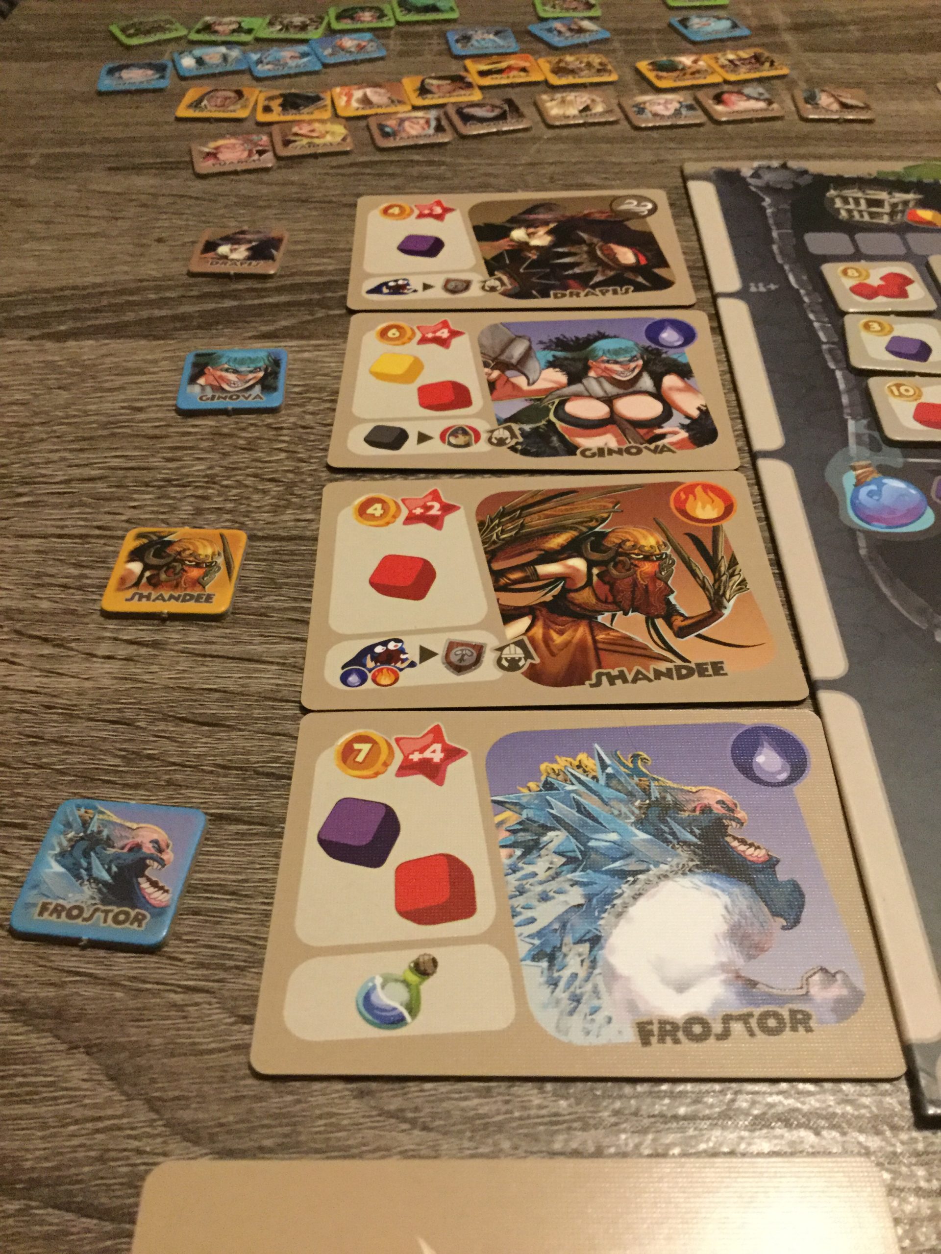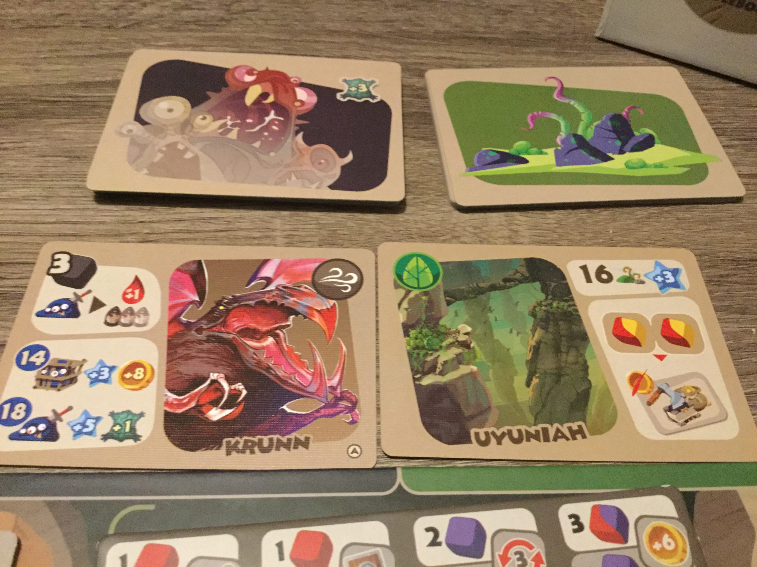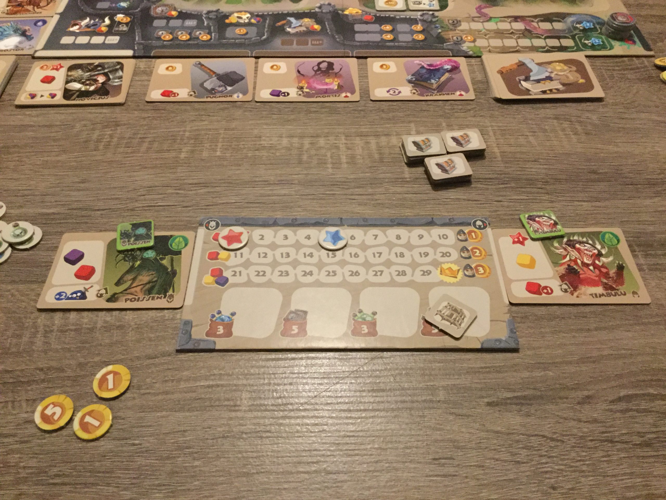 Nettoyage. On récupère les dés affectés, les mercenaires ayant survécu, on paye les salaires (oui rappelez-vous ce sont des mercenaires 😉 ), on pioche des nouveaux monstres si certains ont été vaincus, de nouvelles régions, on change les missions disponibles, etc… Les monstres non attaqués ou éliminés vont se déplacer aux portes de la citadelle. Cela a pour effet de propager la panique dans l’enceinte du château, et un bâtiment à l’intérieur ne sera plus disponible pour les joueurs à partir du prochain tour!