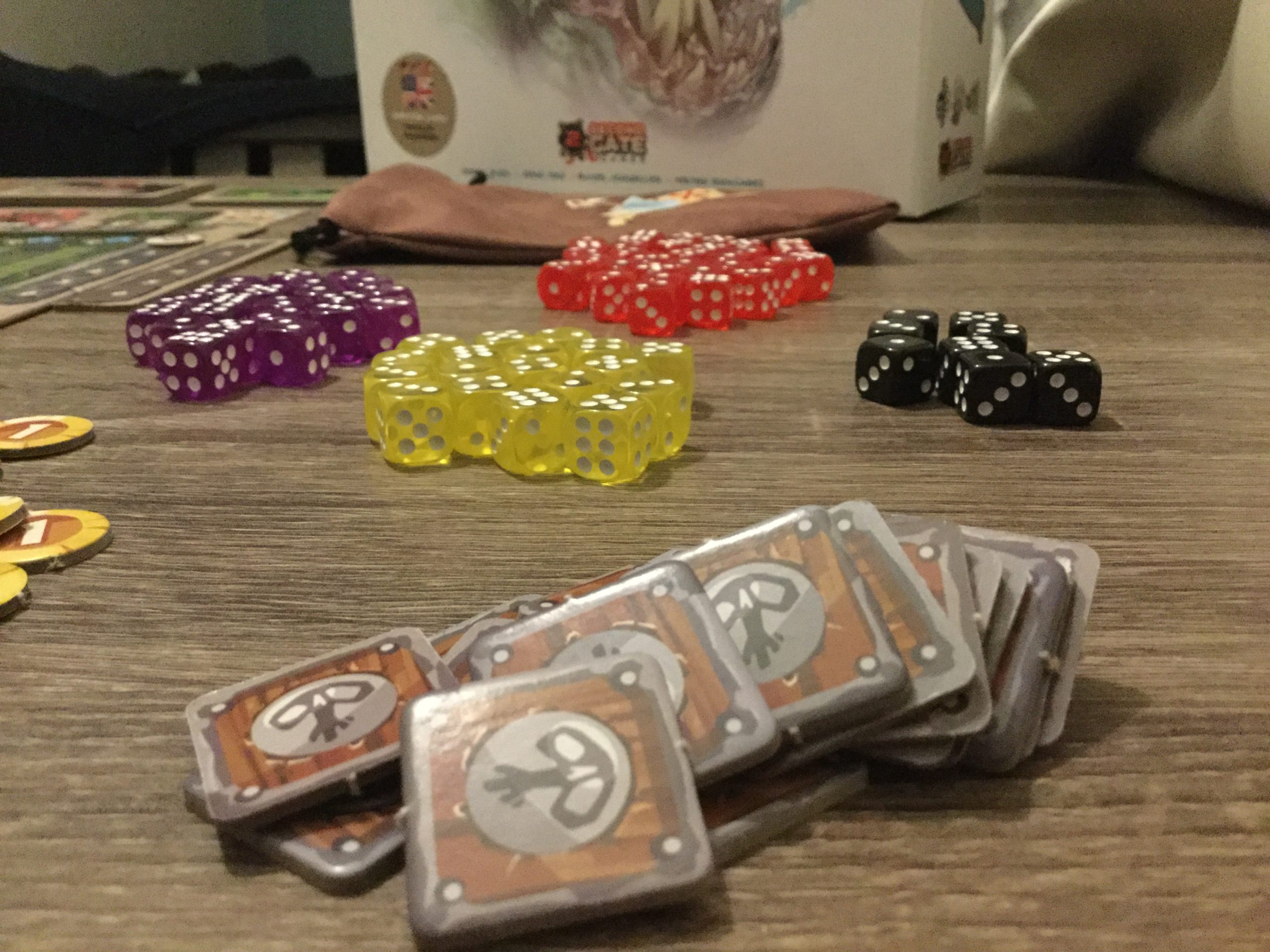 Préparation des réserves de dés. Les mercenaires que vous avez recruté vont contribuer à l’effort du clan en donnant des dés (de différentes couleurs et quantité selon les personnages). Votre piste de gloire au début du tour vous donnera aussi un certain nombre de dés. Ce que vous obtiendrez représentera votre stock pour le tour de jeu.