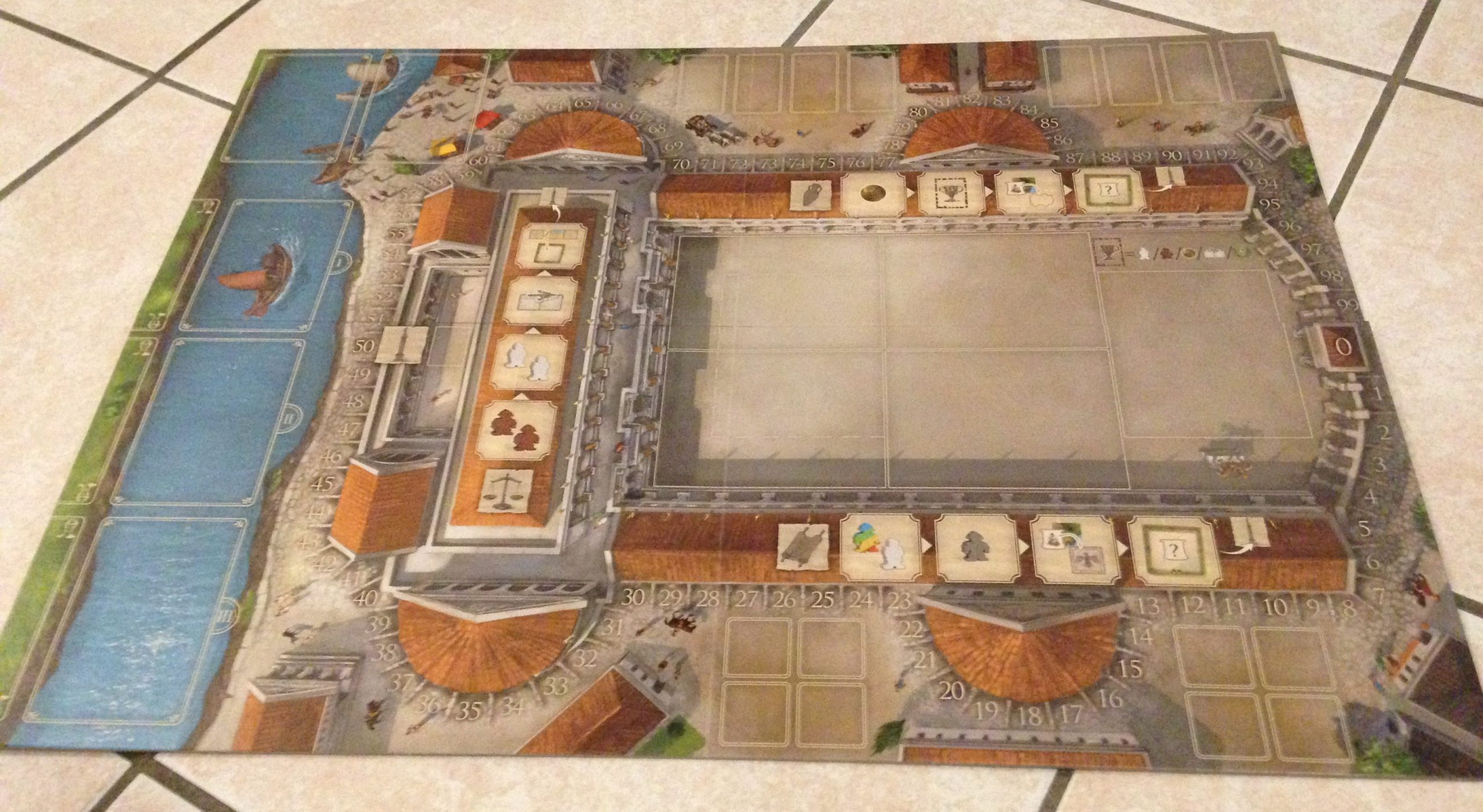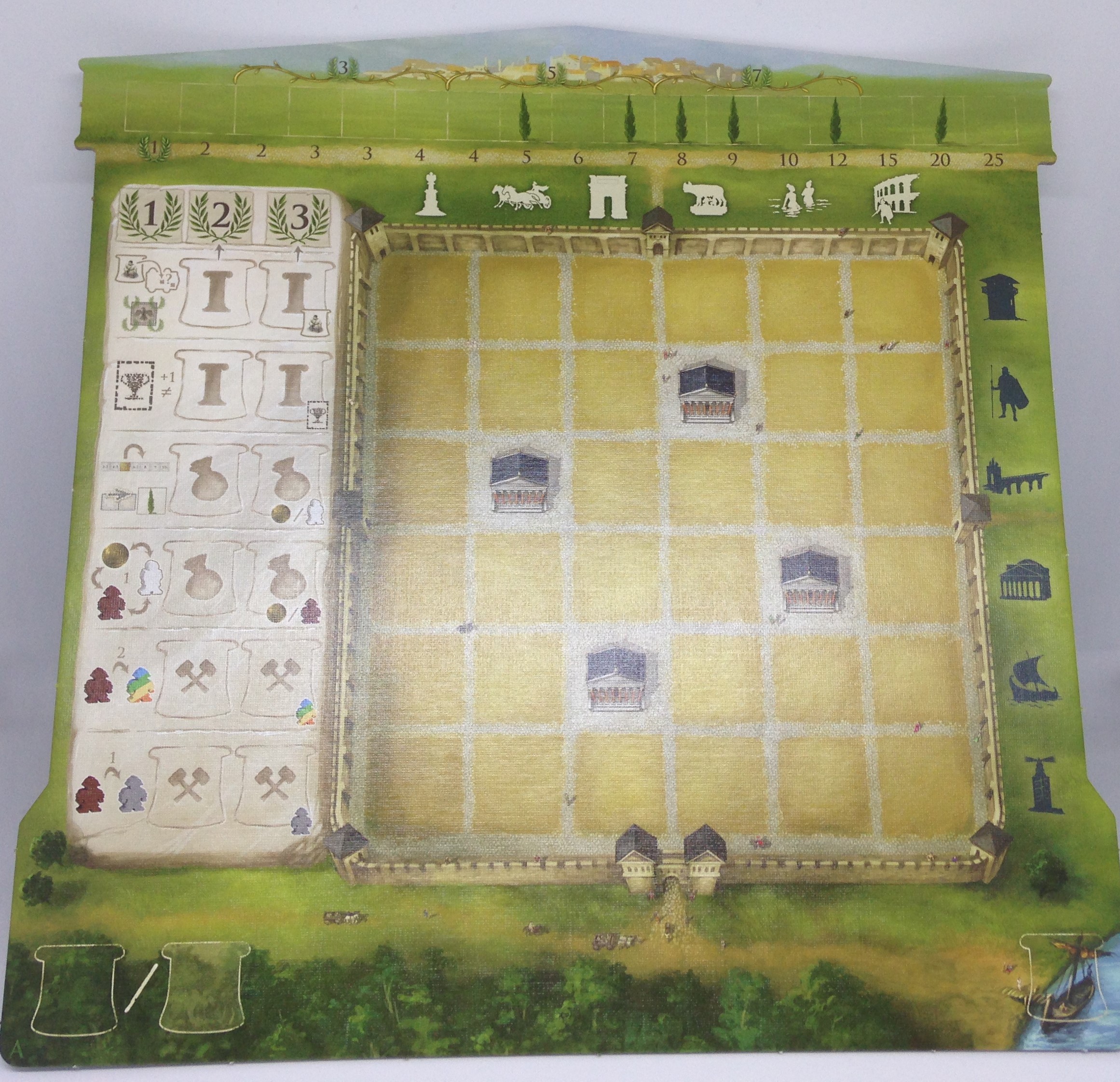 Le plateau central représente le Forum en construction, et une zone commune à tous les joueurs sur l’esplanade du forum.