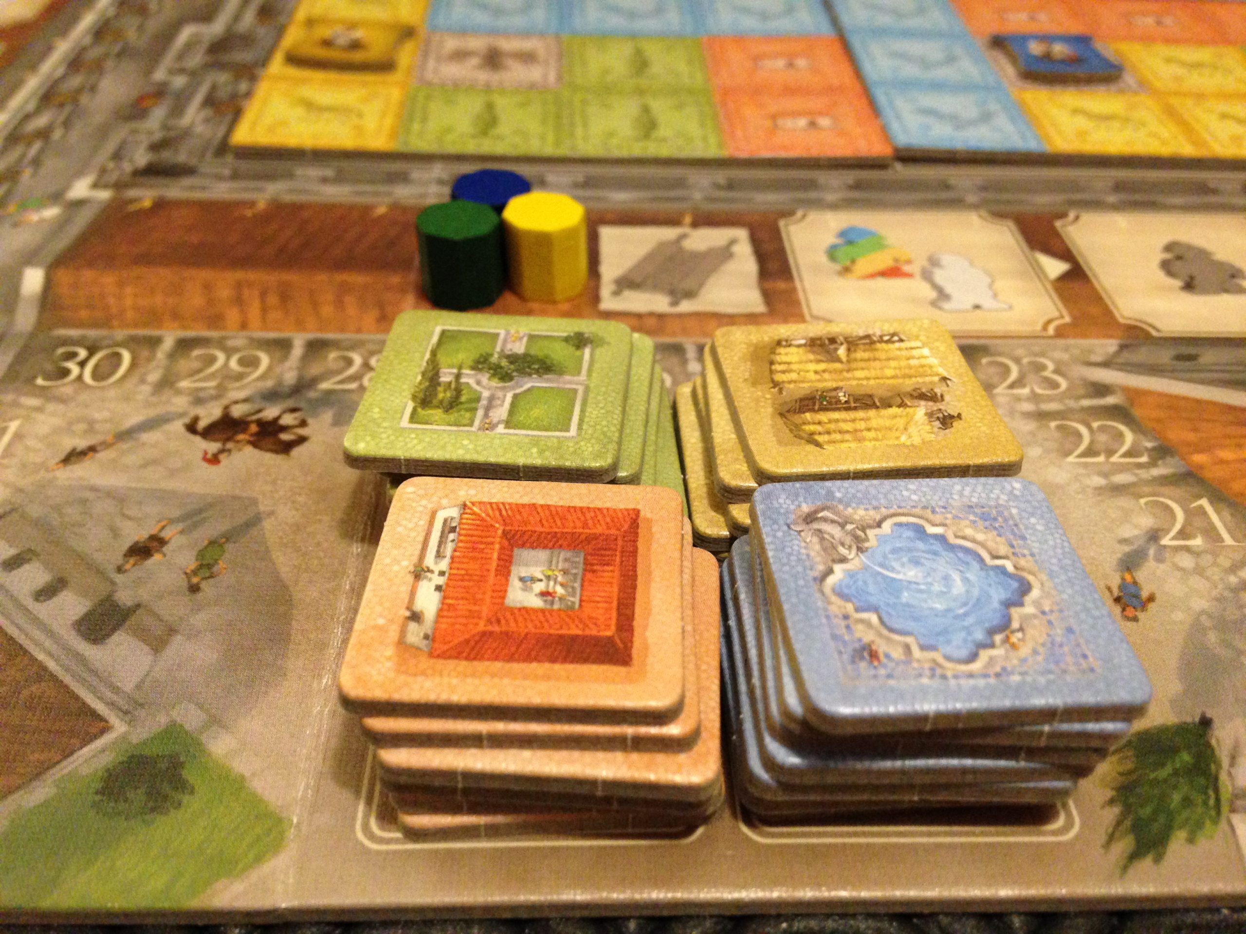 Mais ce n’est pas tout : le jeu offre également la possibilité de prendre des bonus à effet immédiat dans les différents quartiers, de grimper sur les pistes de maîtrise (Eh oui, il faut maîtriser l’art de construire pour que les bâtiments soient beaux et solides !), de récupérer des bonus à long terme au port… Vous pourrez également créer des jardins… Mais je ne suis pas là pour vous expliquer les règles.