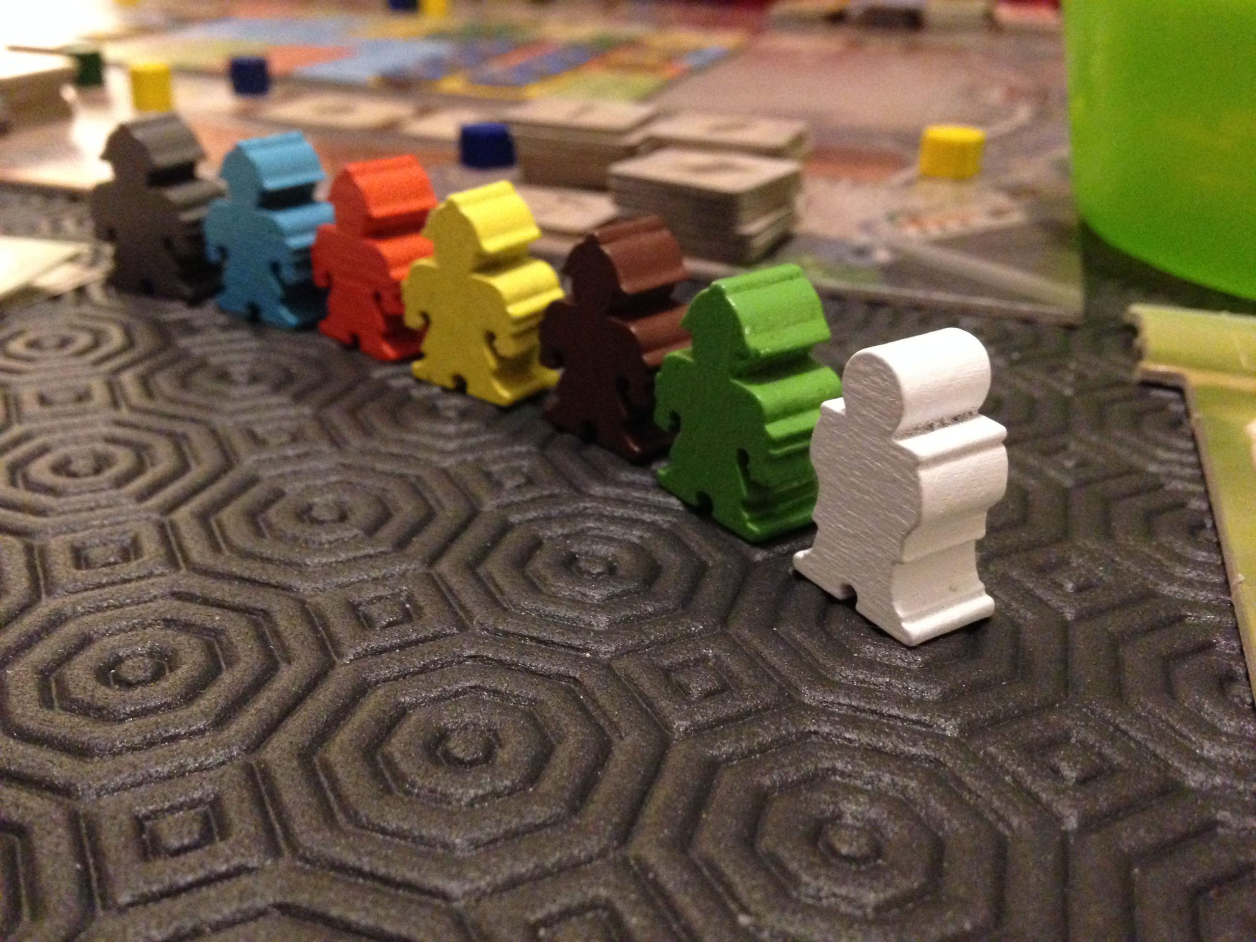 Chaque joueur possède un plateau individuel représentant sa colonie, sur lequel se trouve un réseau quadrillé représentant les rues de votre cité (6×6 cases). Ces rues sont recouvertes de tuiles à votre couleur, qui vous donneront des ressources ou des ouvriers une fois récupérées.