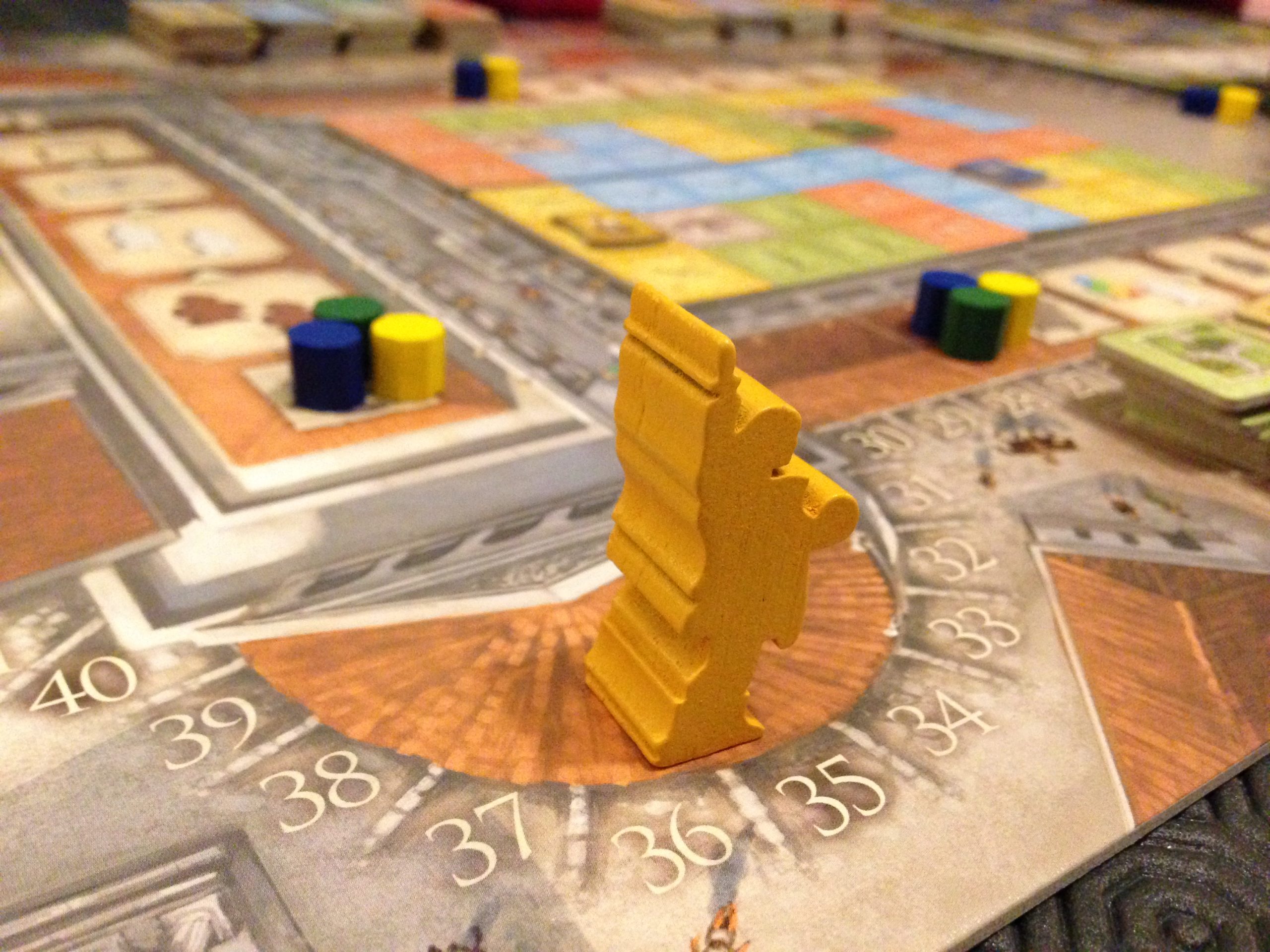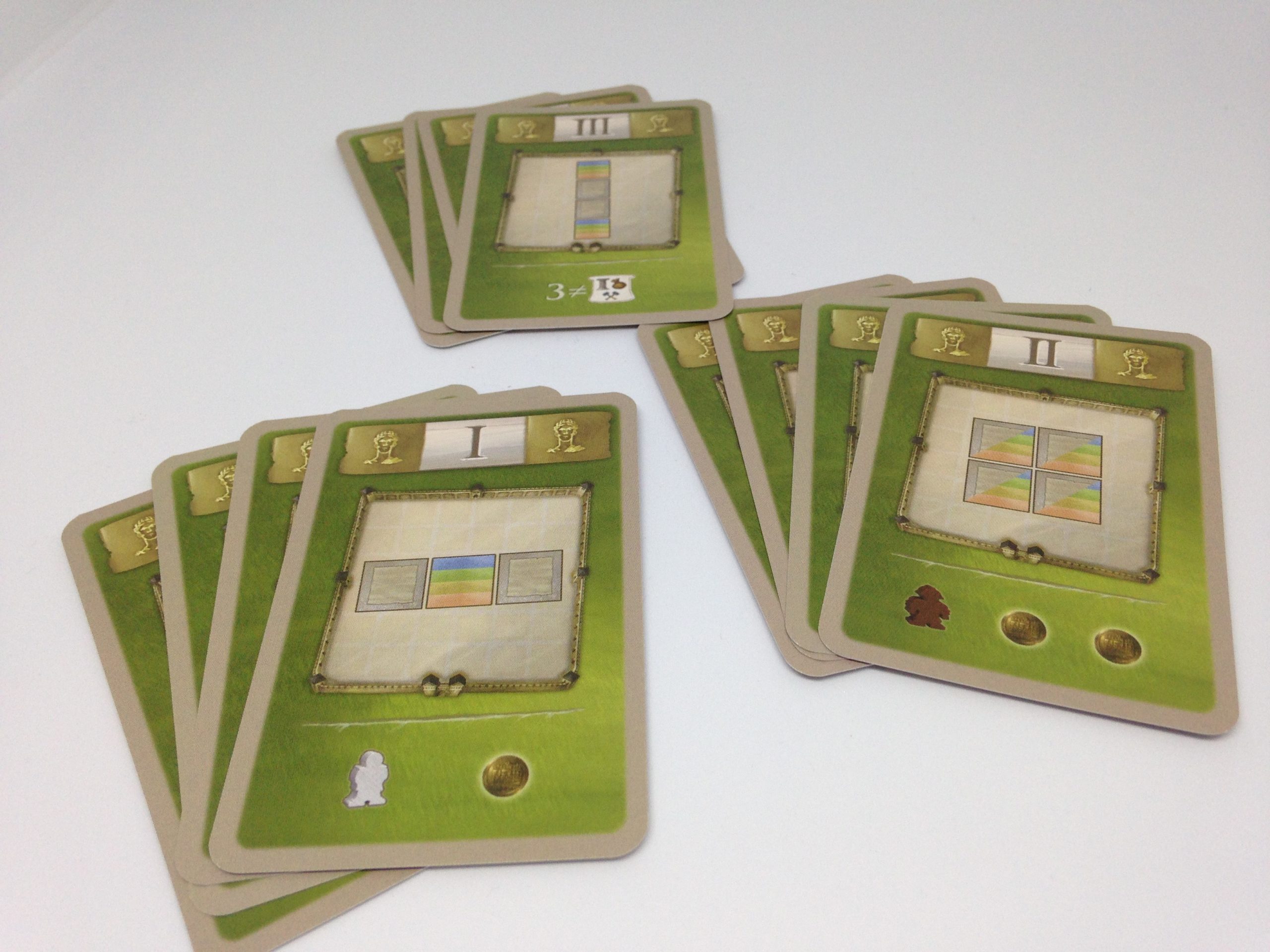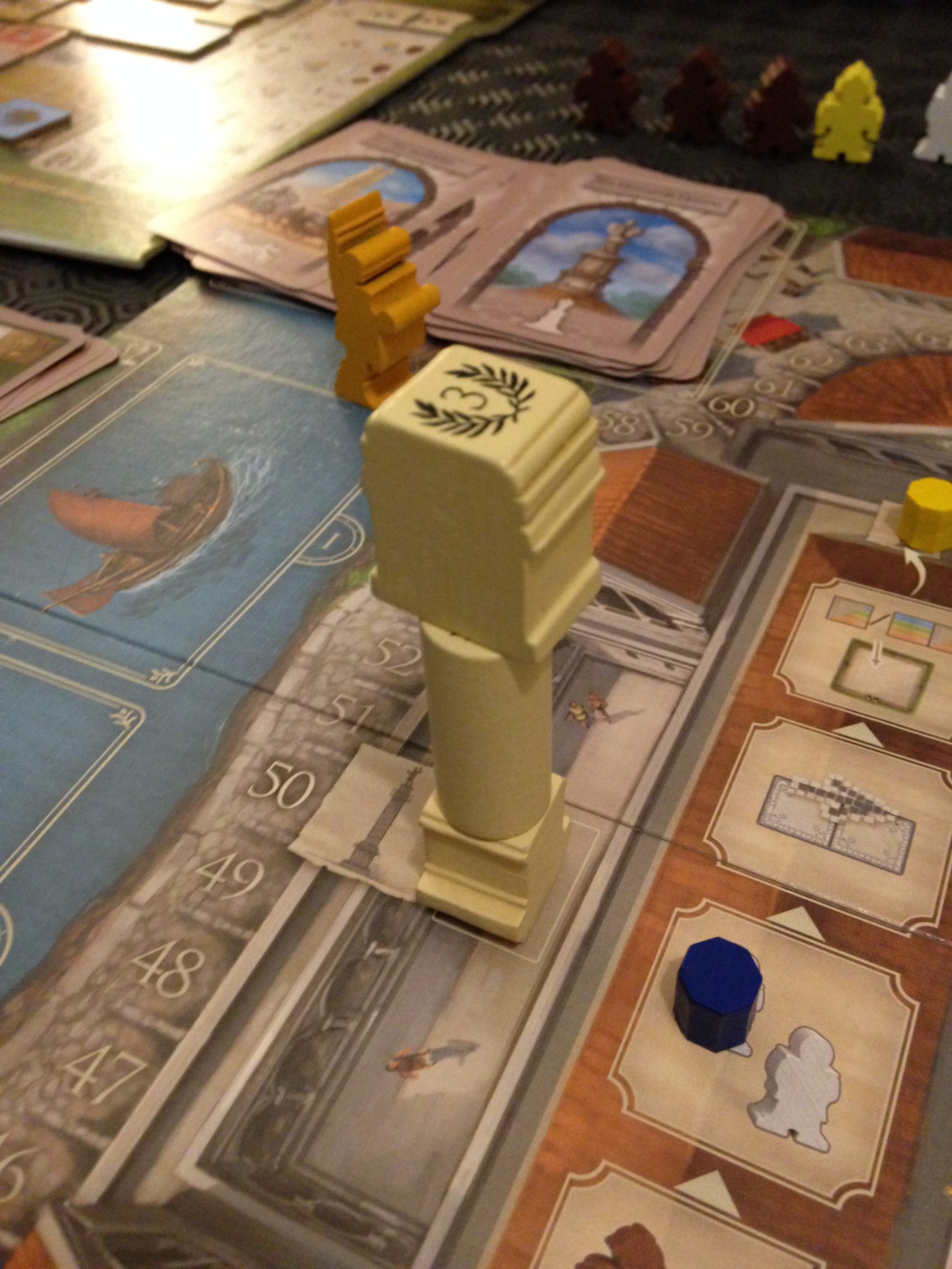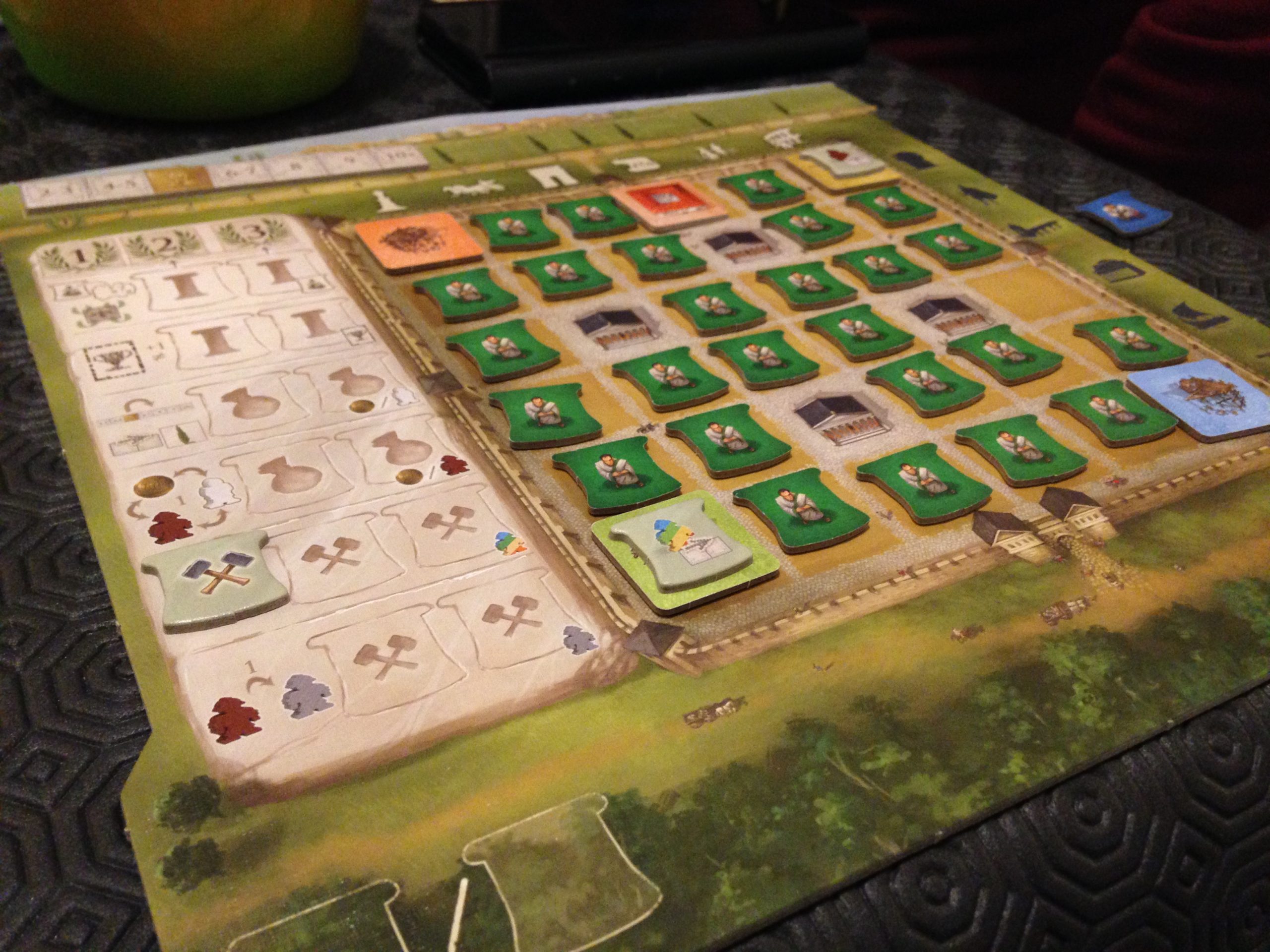 On est clairement dans un jeu stratégique et de gestion. Construire un bâtiment gris sur une rangée de votre cité avec un citoyen vous fera gagner des PV. Construire un bâtiment d’une couleur alors que le bonus de cette couleur est actif à ce tour est un autre choix judicieux. Le bâtiment gris vous permettra en + de débloquer une prime souvent bien utile. Mais un bâtiment de couleur vous permettra d’envoyer un émissaire à Rome et de scorer sur l’esplanade.