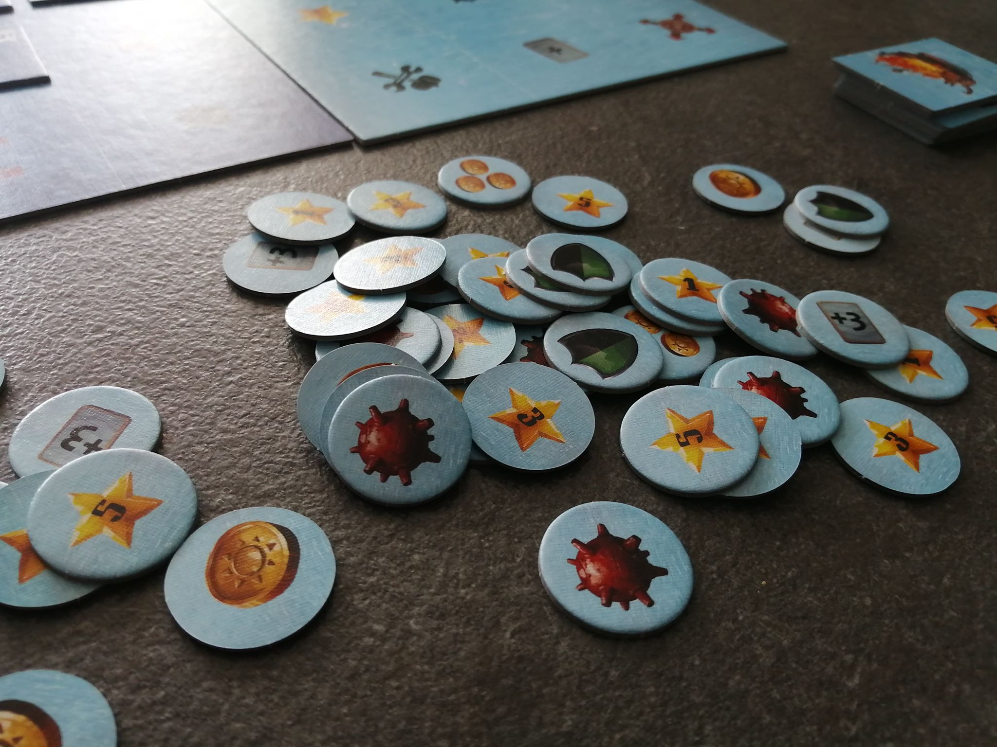 Nous avons ensuite des tuiles de bateaux pirates, 27 par joueur, numérotées de 1 à 9 en 3 exemplaires chacun, plus des bateaux neutres de mercenaires, 5 uniquement seront utilisés dans une partie (encore un élément favorisant la rejouabilité car il y en a 12 en tout), et plein de jetons représentant des points de victoire, de l’or, des mines, etc…