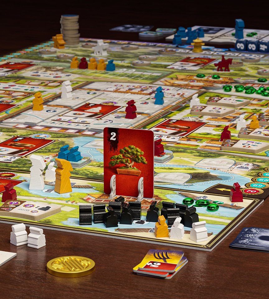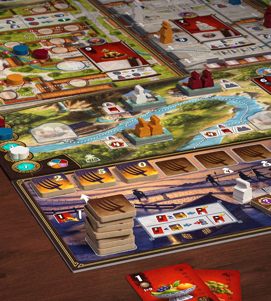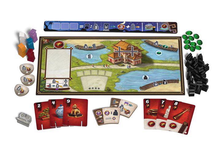 Matériel: Un plateau est ajouté en bas du plateau de jeu. Il représente le palais d’été de l’empereur, des bassins l’entourent pouvant apporter des bonus aux joueurs, le cadeau préféré de l’empereur et un décret de niveau 4.
