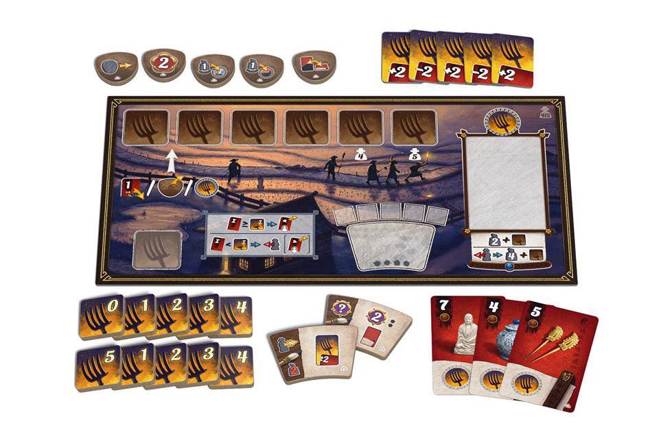 10 jetons de révolte paysanne, 5 jetons de pari, 5 jetons de voyage, 3 cartes cadeau (1 en éventail vide et 2 en Ying-yang) et 2 décrets.