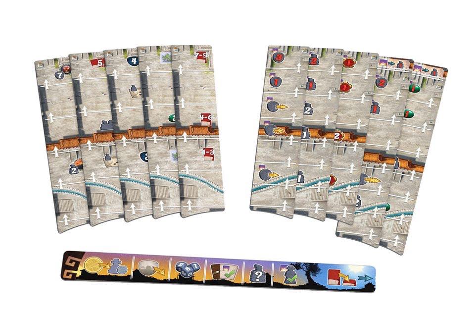 Les pouvoirs des lieux vous feront avancer sur une piste de tuiles bonus, avec une progression à la Tokaïdo, où votre progression sera libre mais où chaque tuile dépassée ne pourra plus être prise. Les tuiles bonus vous apportent des ressources, de l’argent et une stratégie non négligeable pour acquérir des points de victoire quand vous les dépenserez au cours du jeu.