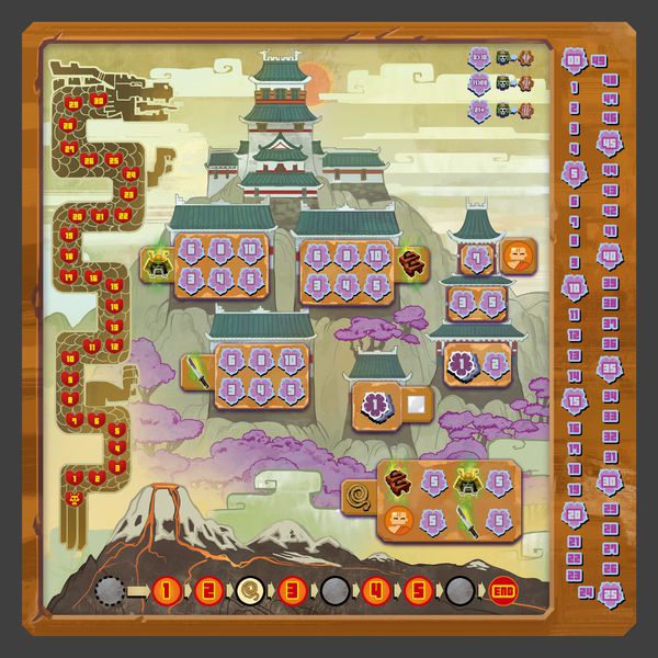Au moment où un joueur arrive ou dépasse 30 PV, les 8 derniers tours de la partie se déclenchent. A partir de ce moment-là, des événements s’ajoutent à chaque tour, comme la montée de la lave réduisant les tuiles praticables, l’apparition de la corde qui permet de s’échapper du volcan … Si un samouraï est situé sur une tuile qui subit une montée du niveau de la lave, il prend automatiquement 5 dégâts. Le compte à rebours sonne un peu le sauve-qui-peut pour les joueurs qui devront prendre leurs jambes à leur cou pour s’échapper du volcan, soit grâce à la corde, soit par la sortie secrète, si elle a été révélée!