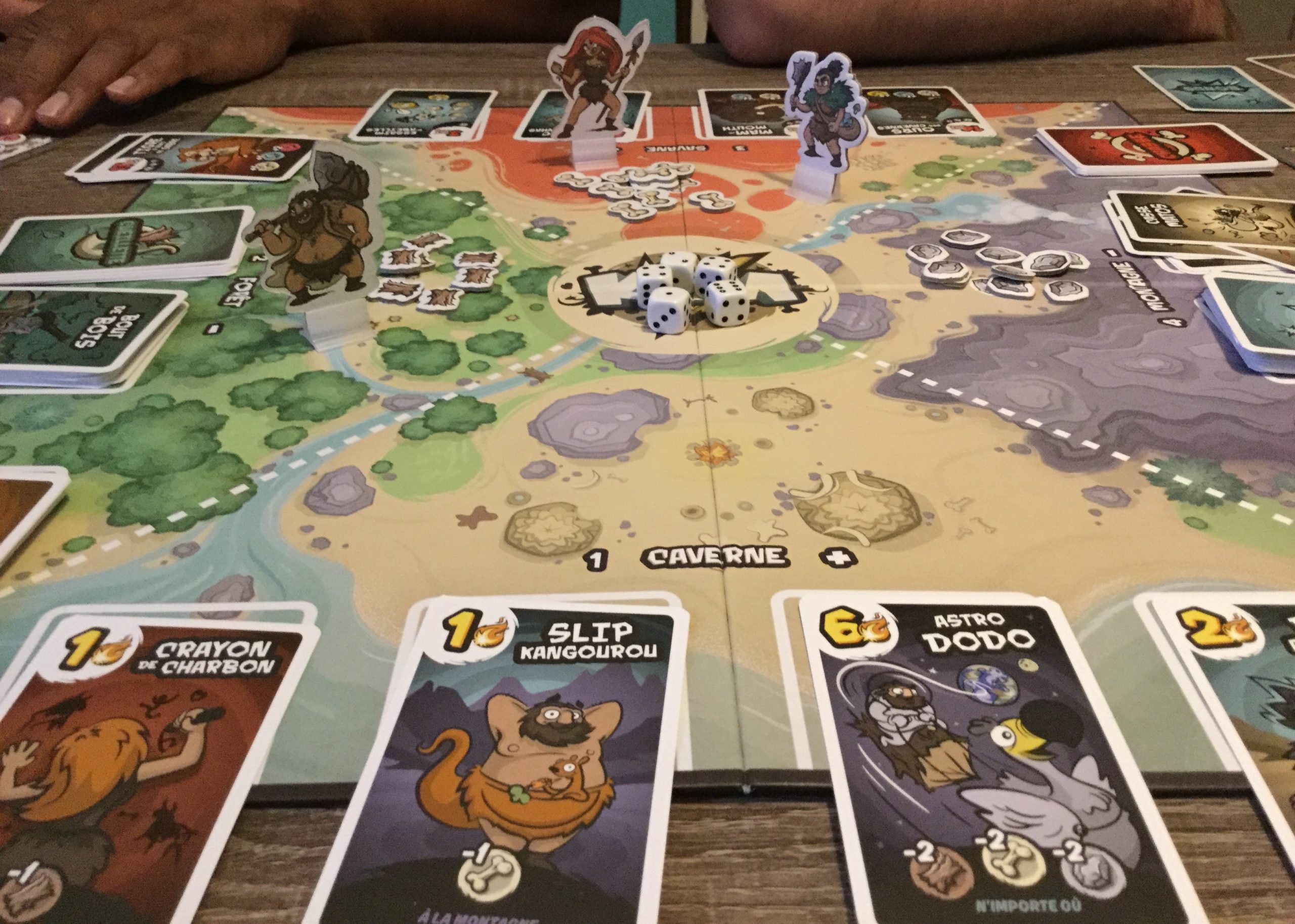 Vous allez donc devoir montrer aux autres que vous savez prendre les bonnes décisions et faire évoluer votre tribu. Le but est d’obtenir 10 points d’évolution que l’on récolte en achetant des kartes évolutions de diverses valeurs. Généralement on les achète contre des ressources (Pierre, bois, os, kroms) et dans des plus ou moins grandes proportions suivant la valeur de la karte évolution visée.