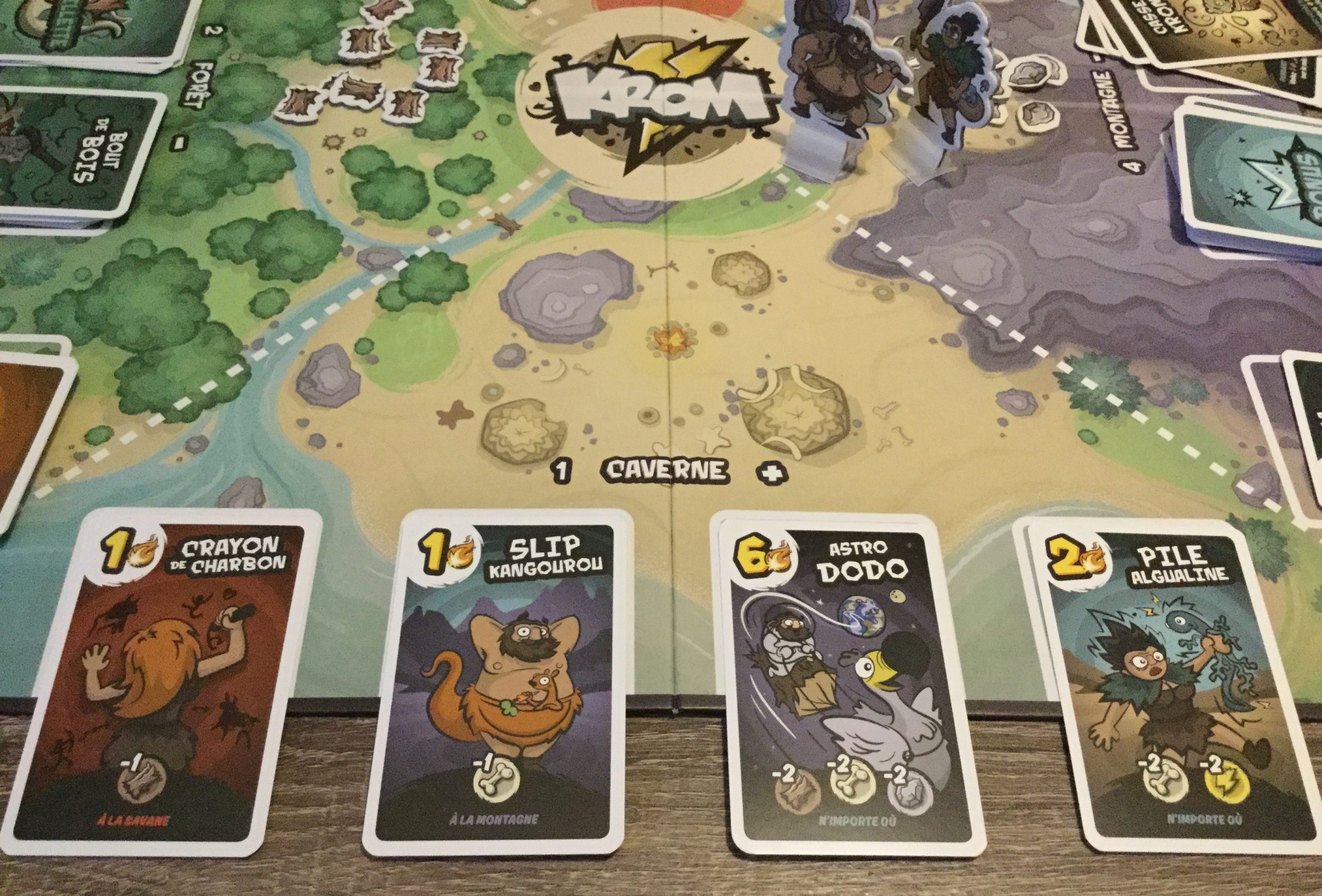 Très bon jeu que voilà! Sans aller jusqu’à proposer des mécaniques trop poussées, Krom est un bon jeu de gestion, placement, kollecte, affrontement et bluff. Tout ça dans un seul jeu! C’est du déjà-vu bien sûr mais ici on garde le positionnement du jeu dans quelque chose de facile à prendre en main, de fun, avec pas mal d’interaction, et surtout un temps de jeu très raisonnable! La thématique de la préhistoire est en plus assez rare dans les jeux, et très bien exploitée ici. Même si on a plus le film Rrrrrrrrr en tête que la vraie préhistoire… 😉