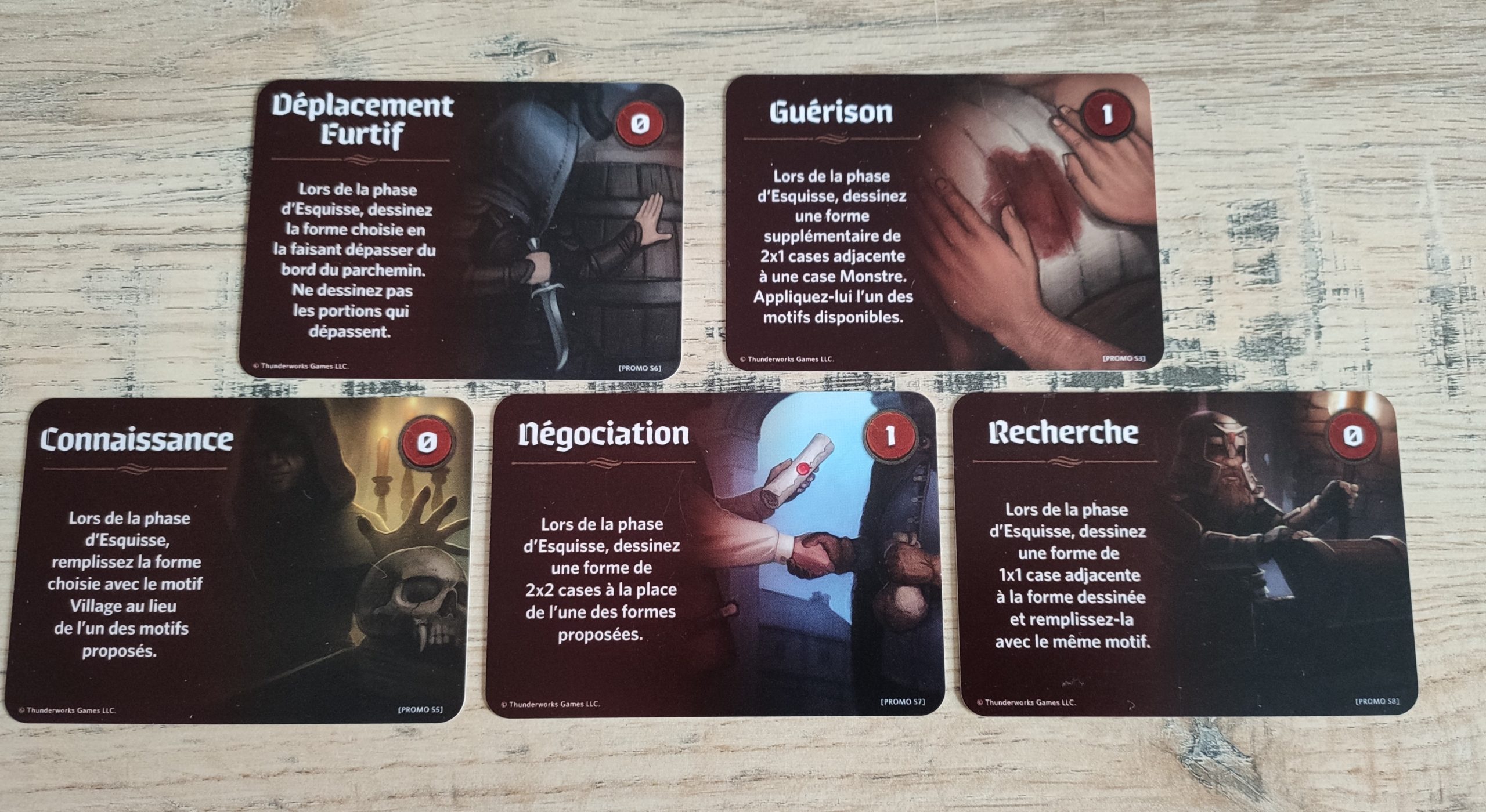 Dans la boîte est incluse une mini-extension qui va rendre disponibles 3 compétences pour la partie. Une fois par saison, vous pourrez activer l’effet d’une des 3 cartes, en payant le coût en pièces indiqué.