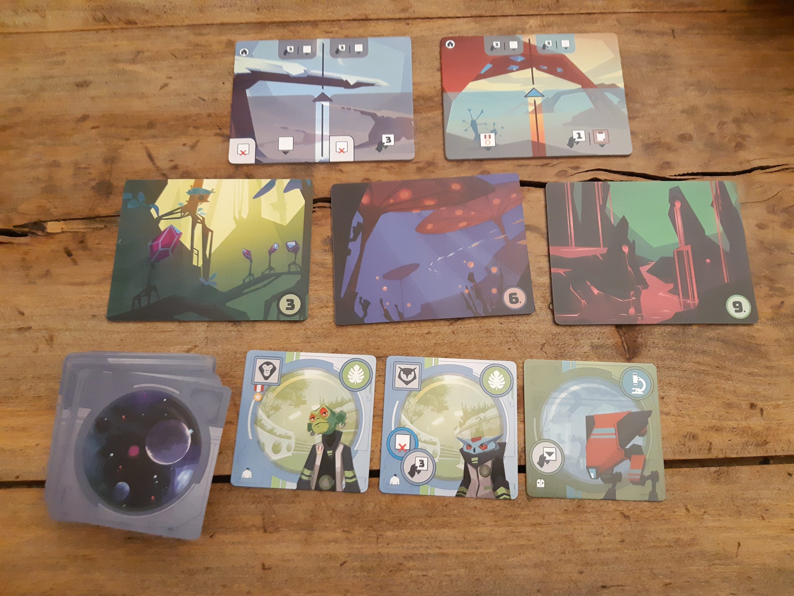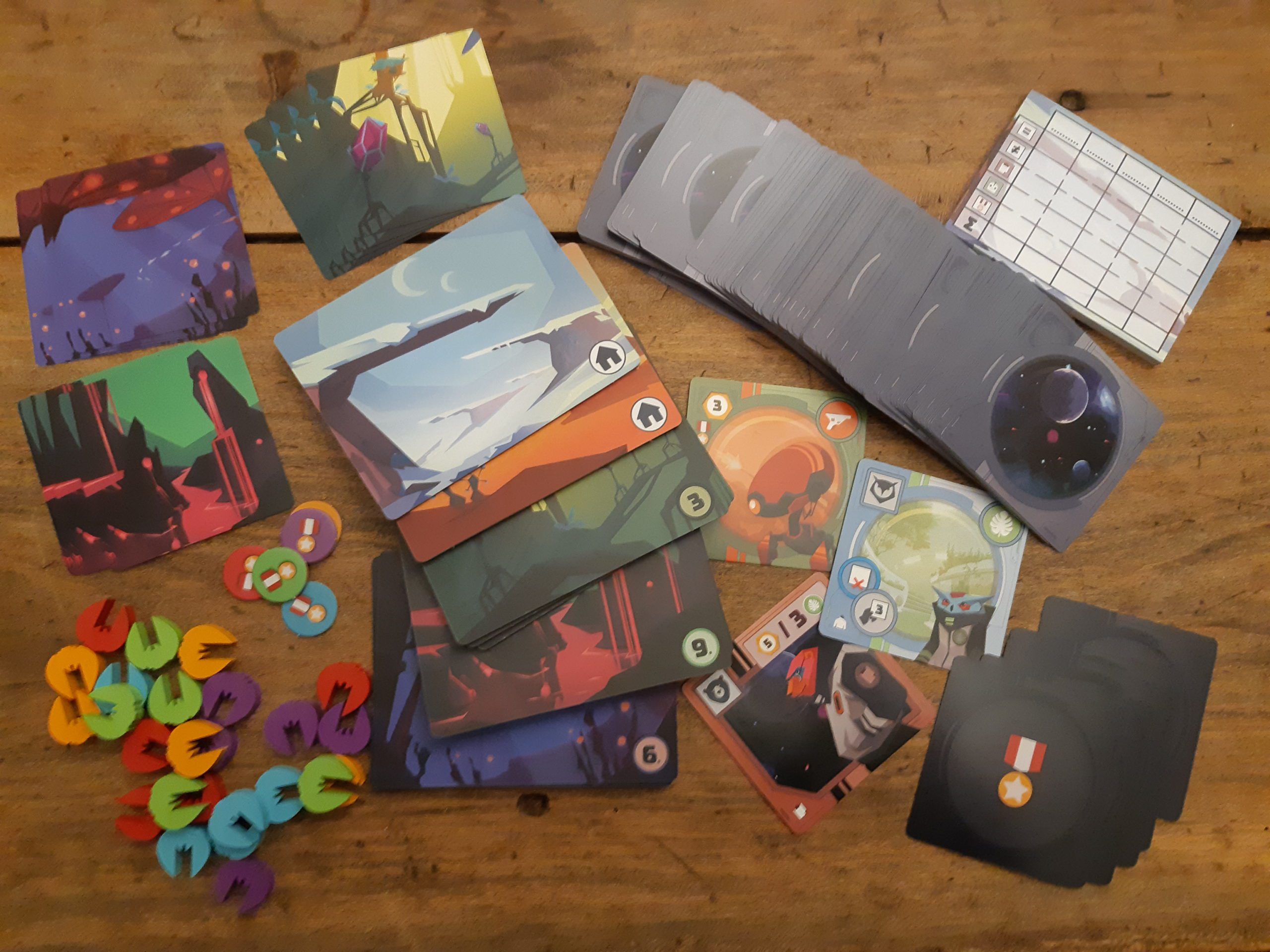 Des tuiles Planète épaisses, plus de cent cartes Équipage de qualité correcte (spécialistes, émissaires, robots et, à part, capitaines), de jolis pions Navette en bois, le tout dans une boîte colorée : ça donne envie.