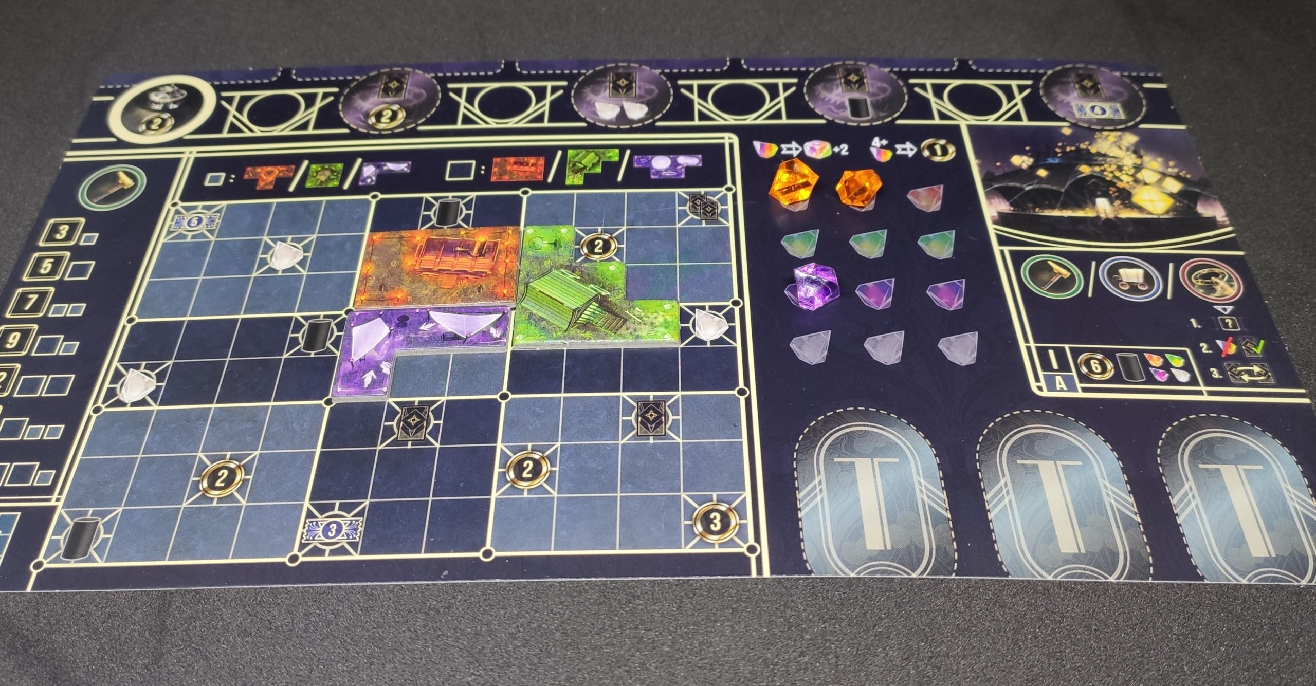 Draft de dés, gestion de ressources, plateau personnel avec placement de tuiles, réalisation d’objectifs avec pré-requis. C’est du solide et c’est très bien ficelé. L’interaction est limitée mais je n’ai pas ressenti un manque à ce niveau tant je bataillais déjà suffisamment dans mon coin pour m’en sortir et établir ma stratégie.