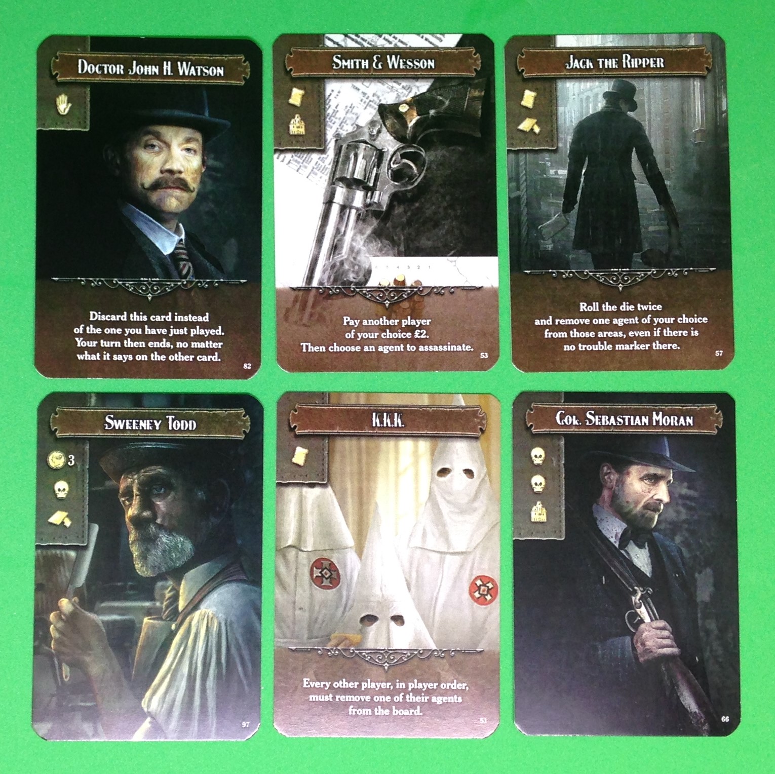 Les événements aléatoires sont du genre à affecter tout le monde sur le plateau… Par exemple si vous tirez la carte Crash de Zeppelin, vous lancerez un dé pour déterminer où le Zeppelin va se crasher et détruire les bâtiments présents dans ce quartier, et les éventuels pions ou agents.