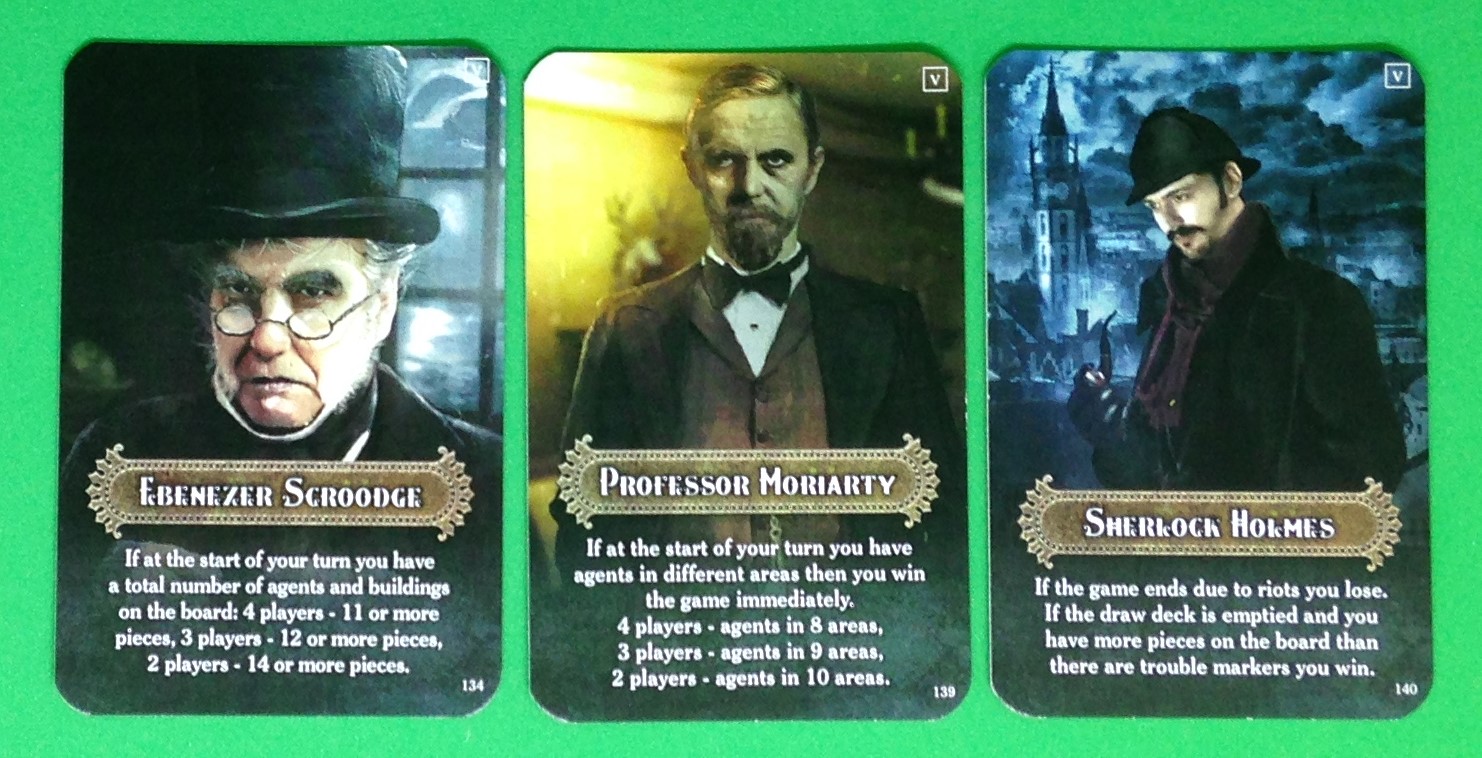 Certains joueurs devront par exemple avoir un certain nombre d’agents dans des quartiers, ou qu’il y ait 8 marqueurs de troubles sur le plateau, ou encore en contrôlant un certain nombre de quartiers, etc…