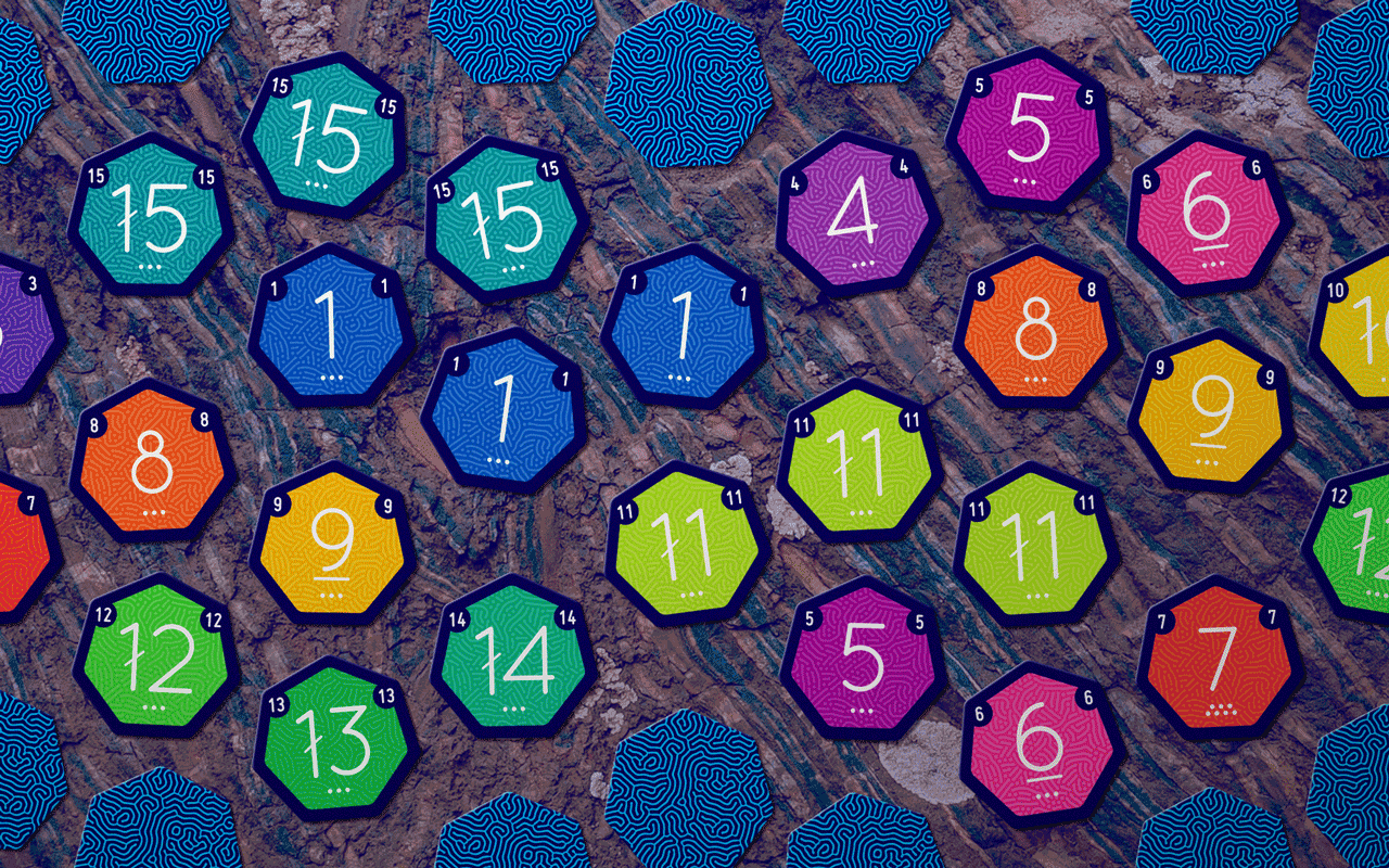 Les cristaux se présentent sous la forme de jetons qui ont des valeurs différentes. Au début de la partie on met en place tous les jetons faces cachées au centre de la table.